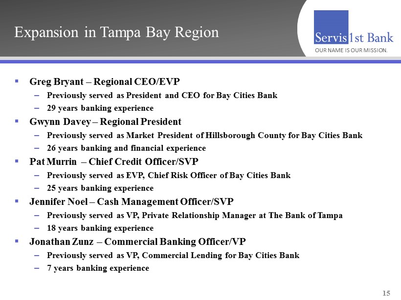 Our Regions Rex D. McKinney EVP and Regional CEO Pensacola ▪ Previously EVP/Senior Commercial Lender for First American Bank/Coastal Bank and Trust ( Synovus ) ▪ 53 years old 14 OUR NAME IS OUR MISSION . Andrew N. Kattos EVP and Regional CEO Huntsville ▪ Previously EVP/Senior Lender for First Commercial Bank ▪ 46 years old Kenneth L. Barber EVP and Regional CEO Atlanta ▪ Previously founding Chairman and CEO of Metro Bancshares ▪ 61 years old William “Bibb” Lamar EVP and Regional CEO Mobile ▪ Previously CEO of BankTrust for over 20 years ▪ 72 years old George C. Barker EVP and Regional CEO Montgomery ▪ Previously Group President for Regions Bank Southeast Alabama Bank Group ▪ 67 years old B. Harrison Morris EVP and Regional CEO Dothan ▪ Previously Market President of Wachovia’s operation in Dothan ▪ 39 years old Greg Bryant EVP and Regional CEO Tampa Bay ▪ Previously President and CEO of Bay Cities Bank in Tampa Bay ▪ 52 years old Thomas G. Trouche EVP and Regional CEO Charleston ▪ Previously Executive Vice President Coastal Division for First Citizens Bank ▪ 52 years old Bradford Vieira S VP and President Nashville ▪ Previously SVP and Commercial Banking Manager at ServisFirst Bank ▪ 40 years old