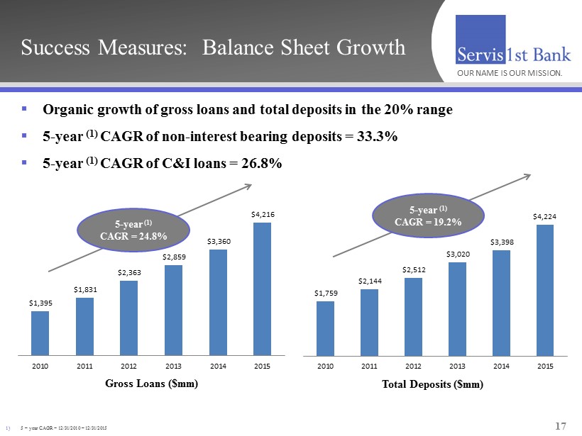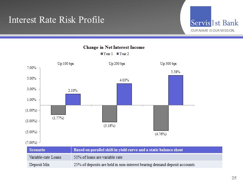 ▪ Our operating structure and business strategy enable efficient, profitable growth Success Measures: Efficiency 24 OUR NAME IS OUR MISSION. Core Efficiency Ratio (1) and Core Non - interest Expense / Average Assets (1) (1) (1) 45.51% 45.54% 41.54% 38.78% 38.86% 40.73% 1.85% 1.79% 1.64% 1.51% 1.47% 1.56% 0.00% 1.00% 2.00% 3.00% 4.00% 5.00% 2010 2011 2012 2013 2014 2015 0.00% 10.00% 20.00% 30.00% 40.00% 50.00% 60.00% 70.00% Core Efficiency Ratio Core Non-interest Expense / Average Assets 1) Core measures in 2015 exclude merger expenses related to the acquisition of Metro Bancshares, Inc . and reserves for losses in unfunded loan commitments and letters of credit resulting from our change in methodology for estimating such losses, and in the first quarter of 2014 resulting from a correction of our accounting for vested stock options previously granted to members of our advisory boards in our markets . For a reconciliation of these non - GAAP measures to the most comparable GAAP measure, see "GAAP Reconciliation and Management Explanation of Non - GAAP Financial Measures" included on page 34 of this presentation .
