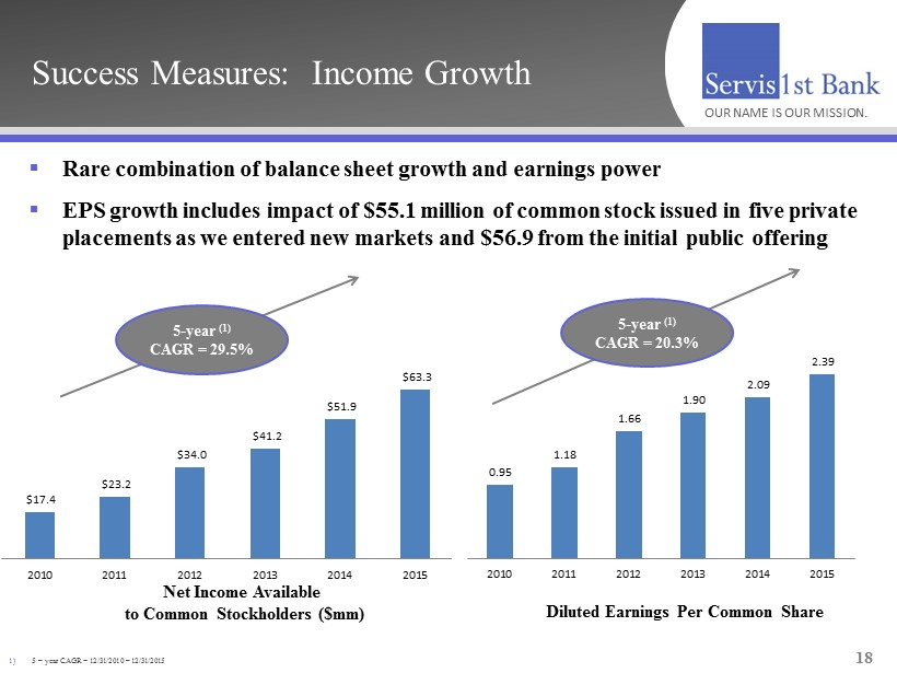 Success Measures: Balance Sheet Growth 17 OUR NAME IS OUR MISSION . 5 - year (1) CAGR = 24.8% 5 - year (1) CAGR = 19.2% Gross Loans ($mm) Total Deposits ($mm) ▪ Organic growth of gross loans and total deposits in the 20% range ▪ 5 - year (1) CAGR of non - interest bearing deposits = 33.3% ▪ 5 - year (1) CAGR of C&I loans = 26.8% $1,395 $1,831 $2,363 $2,859 $3,360 $4,216 2010 2011 2012 2013 2014 2015 1) 5 – year CAGR = 12/31/2010 – 12/31/2015 $1,759 $2,144 $2,512 $3,020 $3,398 $4,224 2010 2011 2012 2013 2014 2015