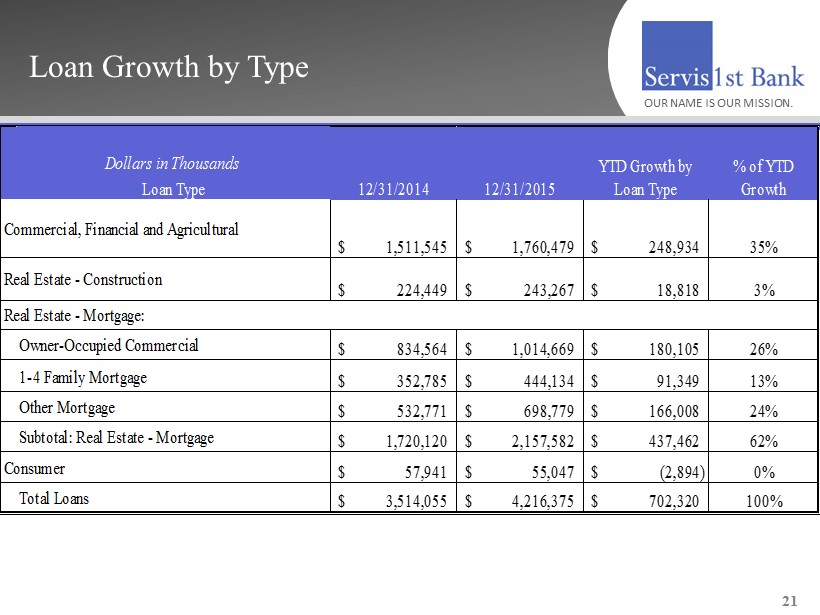 L oan Growth by MSA 20 OUR NAME IS OUR MISSION . 12/31/2014 12/31/2015 YTD Growth by Market Annual Growth Rate Birmingham-Hoover, AL MSA 1,688,897$ 1,944,161$ 255,264$ 15% Mobile, AL MSA 169,565$ 229,935$ 60,370$ 36% Montgomery, AL MSA 318,278$ 362,915$ 44,637$ 14% Dothan, AL MSA 387,681$ 423,944$ 36,263$ 9% Huntsville, AL MSA 432,931$ 445,547$ 12,616$ 3% Total Alabama MSAs 2,997,353$ 3,406,502$ 409,149$ 14% Nashville, TN MSA 121,645$ 268,987$ 147,342$ 121% Charleston, SC MSA -$ 74,067$ 74,067$ NA Pensacola, FL MSA 240,860$ 310,000$ 69,140$ 29% Atlanta, GA MSA 154,197$ 156,819$ 2,622$ 2% Total Loans 3,514,055$ 4,216,375$ 702,320$ 20% Dollars in Thousands MSA
