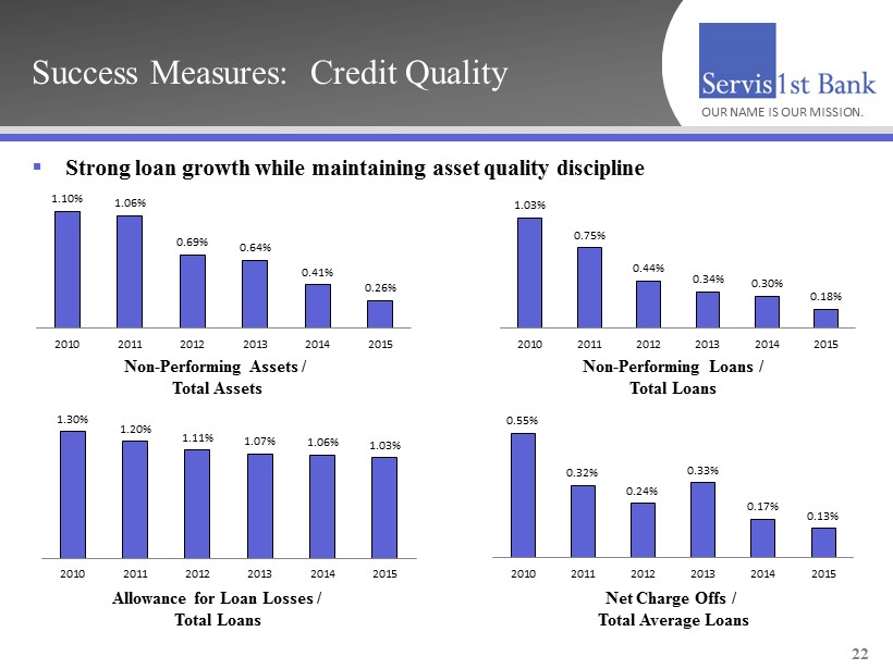 Loan Growth by Type OUR NAME IS OUR MISSION. 21 Dollars in Thousands Loan Type 12/31/2014 12/31/2015 1,511,545$ 1,760,479$ 248,934$ 35% 224,449$ 243,267$ 18,818$ 3% Owner-Occupied Commercial 834,564$ 1,014,669$ 180,105$ 26% 1-4 Family Mortgage 352,785$ 444,134$ 91,349$ 13% Other Mortgage 532,771$ 698,779$ 166,008$ 24% Subtotal: Real Estate - Mortgage 1,720,120$ 2,157,582$ 437,462$ 62% 57,941$ 55,047$ (2,894)$ 0% Total Loans 3,514,055$ 4,216,375$ 702,320$ 100% YTD Growth by Loan Type % of YTD Growth Real Estate - Mortgage: Commercial, Financial and Agricultural Real Estate - Construction Consumer