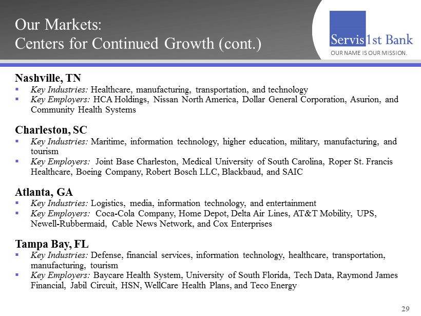 Our Markets: Centers for Continued Growth (cont.) Dothan, AL ▪ Key Industries: Agriculture, manufacturing, and healthcare services ▪ Key Employers: Southeast Alabama Medical Center, Wayne Farms, Southern Nuclear, Michelin Tire, Pemco World Air Services, Globe Motors, and AAA Cooper Transportation Pensacola, FL ▪ Key Industries : M ilitary , health services , medical technology industries, and tourism ▪ Key Employers : Eglin Air Force Base, Hurlburt Field, Pensacola Whiting Field, Pensacola Naval Air Station and Corry Station, Sacred Heart Health System, West Florida Regional Hospital, Gulf Power Company, University of West Florida, Solutia, and GE Wind Energy Mobile, AL ▪ Key Industries : Aircraft assembly, aerospace , steel, ship building, maritime, construction , medicine, and manufacturing ▪ Key Employers : Port of Mobile, Infirmary Health Systems, Austal USA, Brookley Aeroplex , ThyssenKrupp, Infirmary Health Systems, University of South Alabama, ST Aerospace Mobile, and EADS 28 OUR NAME IS OUR MISSION.