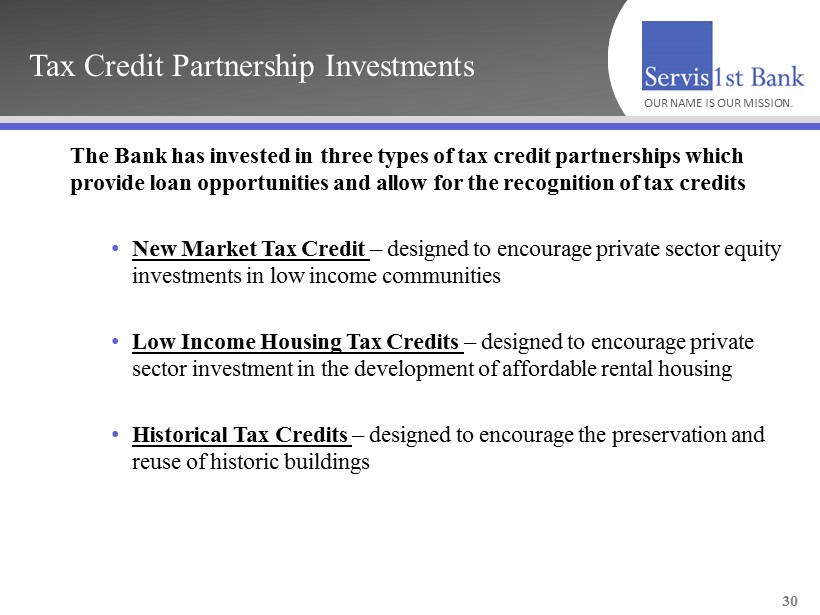 Tax Credit Partnership Investments The Bank has invested in three types of tax credit partnerships which provide loan opportunities and allow for the recognition of tax credits • New Market Tax Credit – designed to encourage private sector equity investments in low income communities • Low Income Housing Tax Credits – designed to encourage private sector investment in the development of affordable rental housing • Historical Tax Credits – designed to encourage the preservation and reuse of historic buildings 30 OUR NAME IS OUR MISSION.