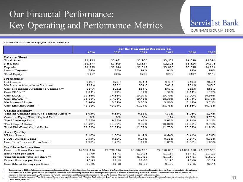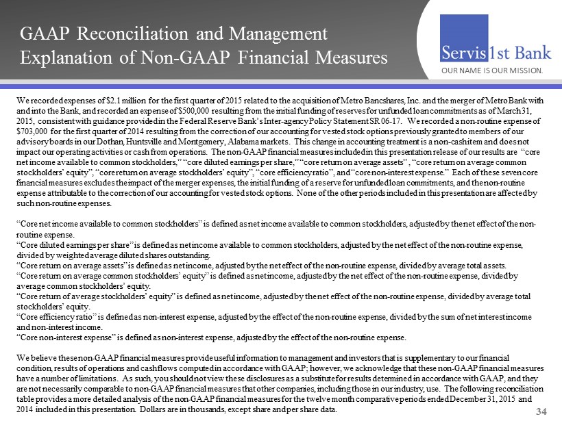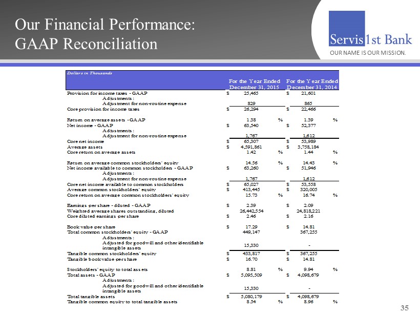 GAAP Reconciliation and Management Explanation of Non - GAAP Financial Measures 34 OUR NAME IS OUR MISSION . W e recorded expenses of $2.1 million for the first quarter of 2015 related to the acquisition of Metro Bancshares, Inc. and the mer ger of Metro Bank with and into the Bank, and recorded an expense of $500,000 resulting from the initial funding of reserves for unfunded loan commi tme nts as of March 31, 2015, consistent with guidance provided in the Federal Reserve Bank’s Inter - agency Policy Statement SR 06 - 17. We recorded a non - routine expense of $703,000 for the first quarter of 2014 resulting from the correction of our accounting for vested stock options previously gr ant ed to members of our advisory boards in our Dothan, Huntsville and Montgomery, Alabama markets. This change in accounting treatment is a non - cash it em and does not impact our operating activities or cash from operations. The non - GAAP financial measures included in this presentation release of our results are “core net income available to common stockholders,” “core diluted earnings per share,” “core return on average assets” , “core return on average common stockholders’ equity”, “core return on average stockholders ’ equity”, “core efficiency ratio”, and “core non - interest expense.” Each of these seven core financial measures excludes the impact of the merger expenses, the initial funding of a reserve for unfunded loan commitments , a nd the non - routine expense attributable to the correction of our accounting for vested stock options. None of the other periods included in thi s presentation are affected by such non - routine expenses. “ Core net income available to common stockholders” is defined as net income available to common stockholders, adjusted by the net effect of the non - routine expense . “Core diluted earnings per share” is defined as net income available to common stockholders, adjusted by the net effect of th e n on - routine expense, divided by weighted average diluted shares outstanding . “Core return on average assets” is defined as net income, adjusted by the net effect of the non - routine expense, divided by aver age total assets . “Core return on average common stockholders’ equity” is defined as net income, adjusted by the net effect of the non - routine exp ense, divided by average common stockholders’ equity . “ Core return of average stockholders’ equity” is defined as net income, adjusted by the net effect of the non - routine expense, di vided by average total stockholders’ equity . “Core efficiency ratio” is defined as non - interest expense, adjusted by the effect of the non - routine expense, divided by the su m of net interest income and non - interest income . “Core non - interest expense” is defined as non - interest expense, adjusted by the effect of the non - routine expense. We believe these non - GAAP financial measures provide useful information to management and investors that is supplementary to our fi nancial condition, results of operations and cash flows computed in accordance with GAAP; however, we acknowledge that these non - GAAP fi nancial measures have a number of limitations. As such, you should not view these disclosures as a substitute for results determined in accor dan ce with GAAP, and they are not necessarily comparable to non - GAAP financial measures that other companies, including those in our industry, use. The f ollowing reconciliation table provides a more detailed analysis of the non - GAAP financial measures for the twelve month comparative periods ended December 31, 2015 and 2014 included in this presentation. Dollars are in thousands, except share and per share data.