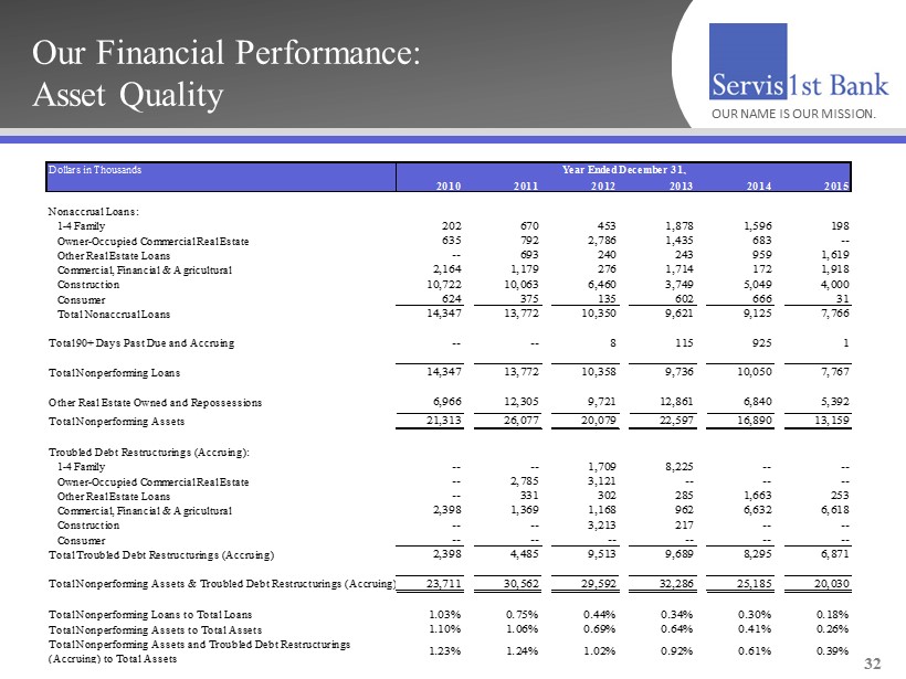 Our Financial Performance: Key Operating and Performance Metrics 31 OUR NAME IS OUR MISSION . Dollars in Millions Except per Share Amounts 2010 2011 2012 2013 2014 2015 Balance Sheet Total Assets $1,935 $2,461 $2,906 $3,521 $4.099 $5.096 Net Loans $1,377 $1,809 $2,337 $2,828 $3.324 $4.173 Deposits $1,759 $2,144 $2,512 $3,020 $3.398 $4.224 Loans / Deposits 79% 85% 94% 95% 99% 99% Total Equity $117 $196 $233 $297 $407 $449 Profitability Net Income $17.4 $23.4 $34.4 $41.6 $52.3 $63.5 Net Income Available to Common $17.4 $23.2 $34.0 $41.2 $51.9 $63.3 Core Net Income Available to Common (1) $17.4 $23.2 $34.0 $41.2 $53.6 $65.0 Core ROAA (1) 1.04% 1.12% 1.31% 1.32% 1.44% 1.42% Core ROAE (1) 15.86% 14.86% 15.99% 15.70% 15.00% 14.96% Core ROACE (1) 15.86% 17.01% 19.41% 18.30% 16.74% 15.73% Net Interest Margin 3.94% 3.79% 3.80% 3.80% 3.68% 3.75% Core Efficiency Ratio (1) 45.51% 45.54% 41.54% 38.78% 38.86% 40.73% Capital Adequacy Tangible Common Equity to Tangible Assets (2) 6.05% 6.35% 6.65% 7.31% 8.96% 8.54% Common Equity Tier 1 Capital Ratio NA NA NA NA NA 9.72% Tier I Leverage Ratio 7.77% 9.17% 8.43% 8.48% 9.91% 8.55% Tier I Capital Ratio 10.22% 11.39% 9.89% 10.00% 11.75% 9.73% Total Risk-Based Capital Ratio 11.82% 12.79% 11.78% 11.73% 13.38% 11.95% Asset Quality NPAs / Assets 1.10% 1.06% 0.69% 0.64% 0.41% 0.26% NCOs / Average Loans 0.55% 0.32% 0.24% 0.33% 0.17% 0.13% Loan Loss Reserve / Gross Loans 1.30% 1.20% 1.11% 1.07% 1.06% 1.03% Per Share Information Common Shares Outstanding 16,582,446 17,796,546 18,806,436 22,050,036 24,801,518 25,972,698 Book Value per Share $7.06 $8.78 $10.28 $11.67 $14.81 $17.29 Tangible Book Value per Share (2) $7.06 $8.78 $10.28 $11.67 $14.81 $16.70 Diluted Earnings per Share $0.95 $1.18 $1.66 $1.90 $2.09 $2.39 Core Diluted Earnings per Share (1) $0.95 $1.18 $1.66 $1.90 $2.16 $2.46 For the Year Ended December 31, 1) Core measures in 2015 exclude merger expenses related to the acquisition of Metro Bancshares, Inc. and reserves for losses in unfunded loan commitm ent s and letters of credit resulting from our change in methodology for estimating such losses, and in the first quarter of 2014 resulting from a correction of our accounting for vested stock options previous ly granted to members of our advisory boards in our markets. For a reconciliation of these non - GAAP measures to the most comparable GAAP measure, see "GAAP Reconciliation and Management Explanation of Non - GAAP Financial Measures " included on page 34 of this presentation. 2) Non - GAAP financial measures . "Tangible Common E quity to total tangible Assets " and "Tangible Book value per Share " are not measures of financial performance recognized by generally accepted accounting principles in the United States, or GAAP .