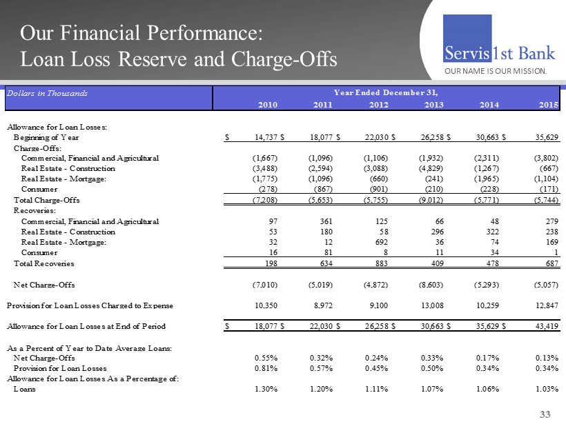 Our Financial Performance: Asset Quality 32 OUR NAME IS OUR MISSION. Dollars in Thousands 2010 2011 2012 2013 2014 2015 Nonaccrual Loans: 1-4 Family 202 670 453 1,878 1,596 198 Owner-Occupied Commercial Real Estate 635 792 2,786 1,435 683 -- Other Real Estate Loans -- 693 240 243 959 1,619 Commercial, Financial & Agricultural 2,164 1,179 276 1,714 172 1,918 Construction 10,722 10,063 6,460 3,749 5,049 4,000 Consumer 624 375 135 602 666 31 Total Nonaccrual Loans 14,347 13,772 10,350 9,621 9,125 7,766 Total 90+ Days Past Due and Accruing -- -- 8 115 925 1 Total Nonperforming Loans 14,347 13,772 10,358 9,736 10,050 7,767 Other Real Estate Owned and Repossessions 6,966 12,305 9,721 12,861 6,840 5,392 Total Nonperforming Assets 21,313 26,077 20,079 22,597 16,890 13,159 Troubled Debt Restructurings (Accruing): 1-4 Family -- -- 1,709 8,225 -- -- Owner-Occupied Commercial Real Estate -- 2,785 3,121 -- -- -- Other Real Estate Loans -- 331 302 285 1,663 253 Commercial, Financial & Agricultural 2,398 1,369 1,168 962 6,632 6,618 Construction -- -- 3,213 217 -- -- Consumer -- -- -- -- -- -- Total Troubled Debt Restructurings (Accruing) 2,398 4,485 9,513 9,689 8,295 6,871 Total Nonperforming Assets & Troubled Debt Restructurings (Accruing) 23,711 30,562 29,592 32,286 25,185 20,030 Total Nonperforming Loans to Total Loans 1.03% 0.75% 0.44% 0.34% 0.30% 0.18% Total Nonperforming Assets to Total Assets 1.10% 1.06% 0.69% 0.64% 0.41% 0.26% Total Nonperforming Assets and Troubled Debt Restructurings (Accruing) to Total Assets 1.23% 1.24% 1.02% 0.92% 0.61% 0.39% Year Ended December 31,
