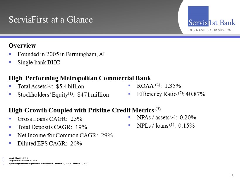 Forward - Looking Statements This presentation contains forward - looking statements within the meaning of the Private Securities Litigation Reform Act of 1995 . In addition, ServisFirst Bancshares, Inc . may file or furnish documents with the Securities and Exchange Commission which contain forward - looking statements and management may make forward - looking statements orally to analysts, investors, representatives of the media and others . These statements are based on the current beliefs and expectations of ServisFirst Bancshares, Inc . ’s management and are subject to significant risks and uncertainties . Actual results may differ from those set forth in the forward - looking statements . Factors that could cause ServisFirst Bancshares, Inc . ’s actual results to differ materially from those described in the forward - looking statements can be found in ServisFirst Bancshares, Inc . ’s Annual Report on Form 10 - K for the year ended December 31 , 2015 , and Quarterly Reports on Form 10 - Q for the quarters ended March 31 , 2016 , September 30 , 2015 , and June, 30 , 2015 which have been filed with the Securities and Exchange Commission and which are available on ServisFirst Bancshares, Inc . ’s website ( www . servisfirstbank . com ) and on the Securities and Exchange Commission’s website ( www . sec . gov ) . ServisFirst Bancshares, Inc . does not undertake to update the forward - looking statements to reflect the impact of circumstances or events that may arise after the date of the forward - looking statements . ▪ Non - GAAP Financial Measures This presentation includes non - GAAP financial measures . Information about any such non - GAAP financial measures, including a reconciliation of those measures to GAAP, can be found in the presentation . 2 OUR NAME IS OUR MISSION.