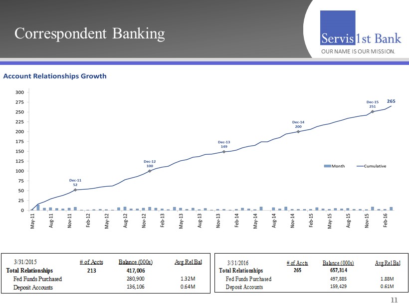 Scalable, Decentralized Structure ▪ Local decision - making – Emphasize local decision - making to drive customer revenue – Centralized, uniform risk management and support – Conservative local lending authorities, covers most lending decisions ▪ Geographic organizational structure (as opposed to line of business structure) ▪ Regional CEOs empowered and held accountable – Utilize stock based compensation to align goals ▪ Top - down sales culture – Senior management actively involved in customer acquisition 10 OUR NAME IS OUR MISSION.