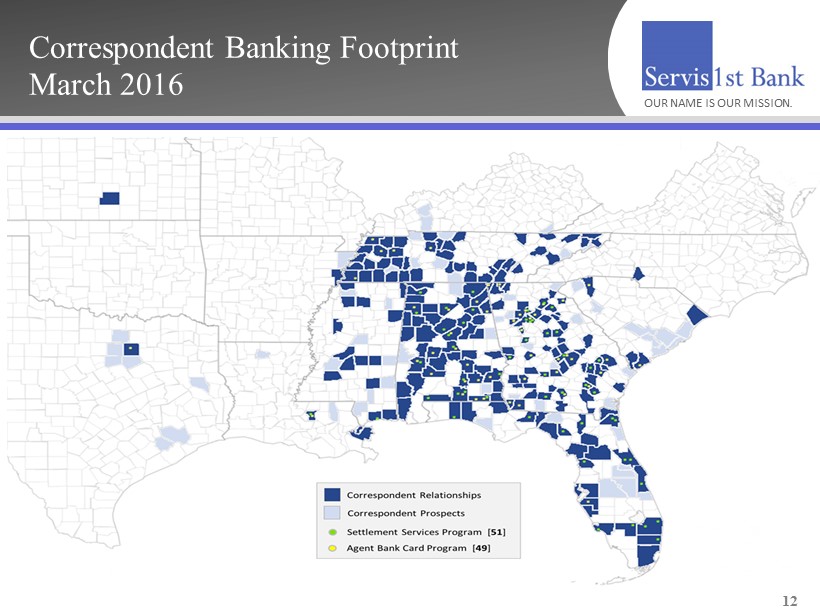 Correspondent Banking OUR NAME IS OUR MISSION . 11 Correspondent bank to 265 community banks 3/31/2015 # of Accts Balance (000s) Avg Rel Bal Total Relationships 213 417,006 Fed Funds Purchased 280,900 1.32M Deposit Accounts 136,106 0.64M 3/31/2016 # of Accts Balance (000s) Avg Rel Bal Total Relationships 265 657,314 Fed Funds Purchased 497,885 1.88M Deposit Accounts 159,429 0.61M