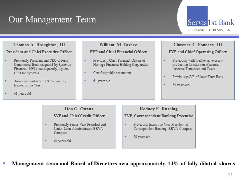 Our Management Team Thomas A. Broughton, III President and Chief Executive Officer ▪ Previously President and CEO of First Commercial Bank (acquired by Synovus Financial, 1992); subsequently, regional CEO for Synovus ▪ American Banker’s 2009 Community Banker of the Year ▪ 61 years old 13 OUR NAME IS OUR MISSION. William M. Foshee EVP and Chief Financial Officer ▪ Previously Chief Financial Officer of Heritage Financial Holding Corporation ▪ Certified public accountant ▪ 61 years old Clarence C. Pouncey , III EVP and Chief Operating Officer ▪ Previously with Wachovia; oversaw production functions in Alabama, Arizona, Tennessee and Texas ▪ Previously SVP of SouthTrust Bank ▪ 59 years old Don G. Owens SVP and Chief Credit Officer ▪ Previously Senior Vice President and Senior Loan Administrator, BBVA - Compass ▪ 64 years old Rodney E. Rushing EVP, Correspondent Banking Executive ▪ Previously Executive Vice President of Correspondent Banking, BBVA - Compass ▪ 58 years old ▪ Management team and Board of Directors own approximately 14% of fully - diluted shares