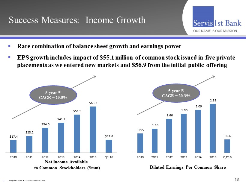 Success Measures: Balance Sheet Growth 17 OUR NAME IS OUR MISSION . 5 - year (1) CAGR = 24.8% 5 - year (1) CAGR = 19.2% Gross Loans ($mm) Total Deposits ($mm) ▪ Organic growth of gross loans and total deposits in the 20% range ▪ 5 - year (1) CAGR of non - interest bearing deposits = 33.3% ▪ 5 - year (1) CAGR of C&I loans = 26.8% $1,395 $1,831 $2,363 $2,859 $3,360 $4,216 $4,341 2010 2011 2012 2013 2014 2015 Q1'16 1) 5 – year CAGR = 12/31/2010 – 12/31/2015 $1,759 $2,144 $2,512 $3,020 $3,398 $4,224 $4,340 2010 2011 2012 2013 2014 2015 Q1'16