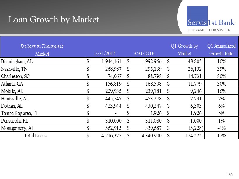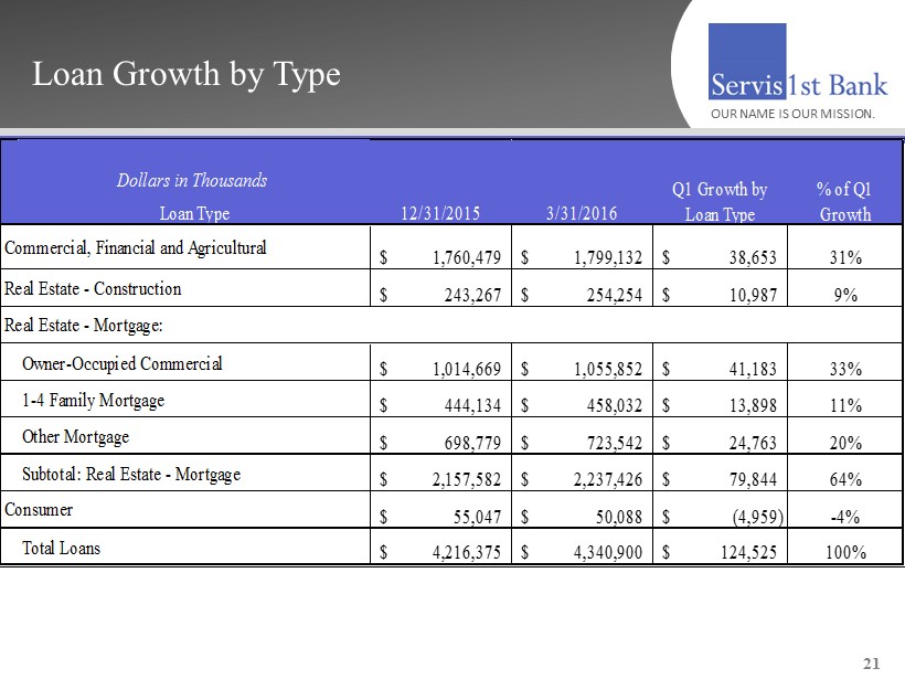 L oan Growth by Market 20 OUR NAME IS OUR MISSION . 12/31/2015 3/31/2016 Q1 Growth by Market Q1 Annualized Growth Rate Birmingham, AL 1,944,161$ 1,992,966$ 48,805$ 10% Nashville, TN 268,987$ 295,139$ 26,152$ 39% Charleston, SC 74,067$ 88,798$ 14,731$ 80% Atlanta, GA 156,819$ 168,598$ 11,779$ 30% Mobile, AL 229,935$ 239,181$ 9,246$ 16% Huntsville, AL 445,547$ 453,278$ 7,731$ 7% Dothan, AL 423,944$ 430,247$ 6,303$ 6% Tampa Bay area, FL -$ 1,926$ 1,926$ NA Pensacola, FL 310,000$ 311,080$ 1,080$ 1% Montgomery, AL 362,915$ 359,687$ (3,228)$ -4% Total Loans 4,216,375$ 4,340,900$ 124,525$ 12% Dollars in Thousands Market