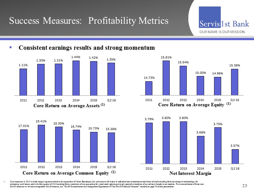 ▪ Strong loan growth while maintaining asset quality discipline Success Measures: Credit Quality 22 OUR NAME IS OUR MISSION. Allowance for Loan Losses / Total Loans Net Charge Offs / Total Average Loans Non - Performing Assets / Total Assets Non - Performing Loans / Total Loans 1.06% 0.69% 0.64% 0.41% 0.26% 0.20% 2011 2012 2013 2014 2015 Q1'16 0.75% 0.44% 0.34% 0.30% 0.18% 0.15% 2011 2012 2013 2014 2015 Q1'16 0.32% 0.24% 0.33% 0.17% 0.13% 0.03% 2011 2012 2013 2014 2015 Q1'16 1.20% 1.11% 1.07% 1.06% 1.03% 1.04% 2011 2012 2013 2014 2015 Q1'16