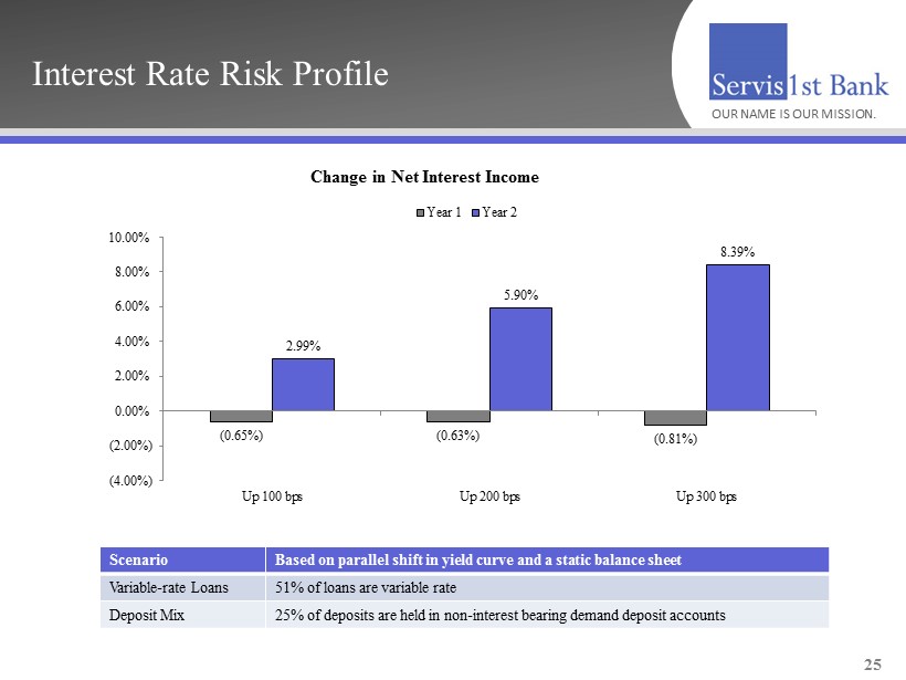 ▪ Our operating structure and business strategy enable efficient, profitable growth Success Measures: Efficiency 24 OUR NAME IS OUR MISSION. Core Efficiency Ratio (1) and Core Non - interest Expense / Average Assets (1) (1) (1) 1) Core measures in 2015 exclude merger expenses related to the acquisition of Metro Bancshares, Inc . and reserves for losses in unfunded loan commitments and letters of credit resulting from our change in methodology for estimating such losses, and in the first quarter of 2014 resulting from a correction of our accounting for vested stock options previously granted to members of our advisory boards in our markets . For a reconciliation of these non - GAAP measures to the most comparable GAAP measure, see "GAAP Reconciliation and Management Explanation of Non - GAAP Financial Measures" included on page 34 of this presentation . 45.54% 41.54% 38.78% 38.86% 40.73% 40.88% 1.79% 1.64% 1.51% 1.47% 1.56% 1.50% 0.00% 1.00% 2.00% 3.00% 4.00% 5.00% 2011 2012 2013 2014 2015 Q1'16 0.00% 10.00% 20.00% 30.00% 40.00% 50.00% 60.00% 70.00% Core Efficiency Ratio Core Non-interest Expense / Average Assets