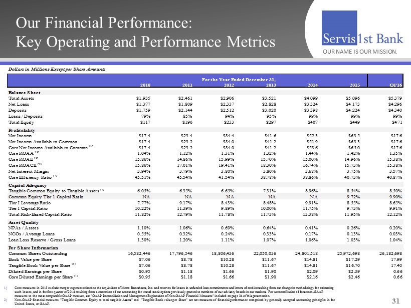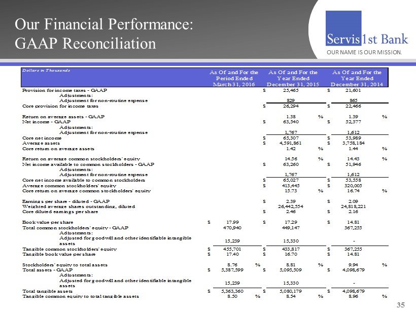 GAAP Reconciliation and Management Explanation of Non - GAAP Financial Measures 34 OUR NAME IS OUR MISSION . W e recorded expenses of $2.1 million for the first quarter of 2015 related to the acquisition of Metro Bancshares, Inc. and the mer ger of Metro Bank with and into the Bank, and recorded an expense of $500,000 resulting from the initial funding of reserves for unfunded loan commi tme nts as of March 31, 2015, consistent with guidance provided in the Federal Reserve Bank’s Inter - agency Policy Statement SR 06 - 17. We recorded a non - routine expense of $703,000 for the first quarter of 2014 resulting from the correction of our accounting for vested stock options previously gr ant ed to members of our advisory boards in our Dothan, Huntsville and Montgomery, Alabama markets. This change in accounting treatment is a non - cash it em and does not impact our operating activities or cash from operations. The non - GAAP financial measures included in this presentation release of our results are “core net income available to common stockholders,” “core diluted earnings per share,” “core return on average assets” , “core return on average common stockholders’ equity”, “core return on average stockholders ’ equity”, “core efficiency ratio”, and “core non - interest expense.” Each of these seven core financial measures excludes the impact of the merger expenses, the initial funding of a reserve for unfunded loan commitments , a nd the non - routine expense attributable to the correction of our accounting for vested stock options. None of the other periods included in thi s presentation are affected by such non - routine expenses. “ Core net income available to common stockholders” is defined as net income available to common stockholders, adjusted by the net effect of the non - routine expense . “Core diluted earnings per share” is defined as net income available to common stockholders, adjusted by the net effect of th e n on - routine expense, divided by weighted average diluted shares outstanding . “Core return on average assets” is defined as net income, adjusted by the net effect of the non - routine expense, divided by aver age total assets . “Core return on average common stockholders’ equity” is defined as net income, adjusted by the net effect of the non - routine exp ense, divided by average common stockholders’ equity . “ Core return of average stockholders’ equity” is defined as net income, adjusted by the net effect of the non - routine expense, di vided by average total stockholders’ equity . “Core efficiency ratio” is defined as non - interest expense, adjusted by the effect of the non - routine expense, divided by the su m of net interest income and non - interest income . “Core non - interest expense” is defined as non - interest expense, adjusted by the effect of the non - routine expense. We believe these non - GAAP financial measures provide useful information to management and investors that is supplementary to our fi nancial condition, results of operations and cash flows computed in accordance with GAAP; however, we acknowledge that these non - GAAP fi nancial measures have a number of limitations. As such, you should not view these disclosures as a substitute for results determined in accor dan ce with GAAP, and they are not necessarily comparable to non - GAAP financial measures that other companies, including those in our industry, use. The f ollowing reconciliation table provides a more detailed analysis of the non - GAAP financial measures for the twelve month comparative periods ended December 31, 2015 and 2014 included in this presentation. Dollars are in thousands, except share and per share data.