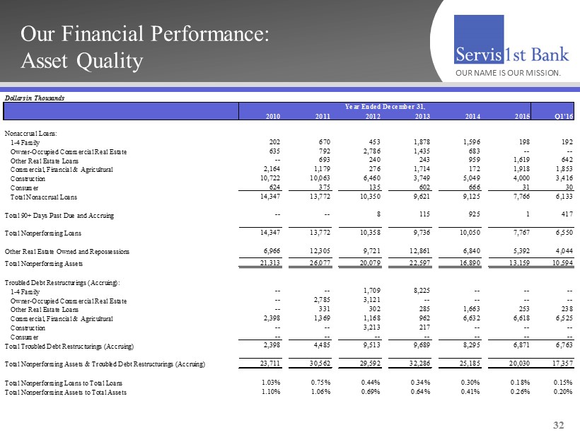 Our Financial Performance: Key Operating and Performance Metrics 31 OUR NAME IS OUR MISSION . Dollars in Millions Except per Share Amounts 2010 2011 2012 2013 2014 2015 Q1'16 Balance Sheet Total Assets $1,935 $2,461 $2,906 $3,521 $4.099 $5.096 $5.379 Net Loans $1,377 $1,809 $2,337 $2,828 $3.324 $4.173 $4.296 Deposits $1,759 $2,144 $2,512 $3,020 $3.398 $4.224 $4.340 Loans / Deposits 79% 85% 94% 95% 99% 99% 99% Total Equity $117 $196 $233 $297 $407 $449 $471 Profitability Net Income $17.4 $23.4 $34.4 $41.6 $52.3 $63.5 $17.6 Net Income Available to Common $17.4 $23.2 $34.0 $41.2 $51.9 $63.3 $17.6 Core Net Income Available to Common (1) $17.4 $23.2 $34.0 $41.2 $53.6 $65.0 $17.6 Core ROAA (1) 1.04% 1.12% 1.31% 1.32% 1.44% 1.42% 1.35% Core ROAE (1) 15.86% 14.86% 15.99% 15.70% 15.00% 14.96% 15.38% Core ROACE (1) 15.86% 17.01% 19.41% 18.30% 16.74% 15.73% 15.38% Net Interest Margin 3.94% 3.79% 3.80% 3.80% 3.68% 3.75% 3.57% Core Efficiency Ratio (1) 45.51% 45.54% 41.54% 38.78% 38.86% 40.73% 40.87% Capital Adequacy Tangible Common Equity to Tangible Assets (2) 6.05% 6.35% 6.65% 7.31% 8.96% 8.54% 8.50% Common Equity Tier 1 Capital Ratio NA NA NA NA NA 9.72% 9.90% Tier I Leverage Ratio 7.77% 9.17% 8.43% 8.48% 9.91% 8.55% 8.65% Tier I Capital Ratio 10.22% 11.39% 9.89% 10.00% 11.75% 9.73% 9.91% Total Risk-Based Capital Ratio 11.82% 12.79% 11.78% 11.73% 13.38% 11.95% 12.12% Asset Quality NPAs / Assets 1.10% 1.06% 0.69% 0.64% 0.41% 0.26% 0.20% NCOs / Average Loans 0.55% 0.32% 0.24% 0.33% 0.17% 0.13% 0.03% Loan Loss Reserve / Gross Loans 1.30% 1.20% 1.11% 1.07% 1.06% 1.03% 1.04% Per Share Information Common Shares Outstanding 16,582,446 17,796,546 18,806,436 22,050,036 24,801,518 25,972,698 26,182,698 Book Value per Share $7.06 $8.78 $10.28 $11.67 $14.81 $17.29 17.99 Tangible Book Value per Share (2) $7.06 $8.78 $10.28 $11.67 $14.81 $16.70 17.40 Diluted Earnings per Share $0.95 $1.18 $1.66 $1.90 $2.09 $2.39 0.66 Core Diluted Earnings per Share (1) $0.95 $1.18 $1.66 $1.90 $2.16 $2.46 0.66 For the Year Ended December 31, 1) Core measures in 2015 exclude merger expenses related to the acquisition of Metro Bancshares, Inc. and reserves for losses in unfunded loan commitm ent s and letters of credit resulting from our change in methodology for estimating such losses, and in the first quarter of 2014 resulting from a correction of our accounting for vested stock options previous ly granted to members of our advisory boards in our markets. For a reconciliation of these non - GAAP measures to the most comparable GAAP measure, see "GAAP Reconciliation and Management Explanation of Non - GAAP Financial Measures " included on page 34 of this presentation. 2) Non - GAAP financial measures . "Tangible Common E quity to total tangible Assets " and "Tangible Book value per Share " are not measures of financial performance recognized by generally accepted accounting principles in the United States, or GAAP .