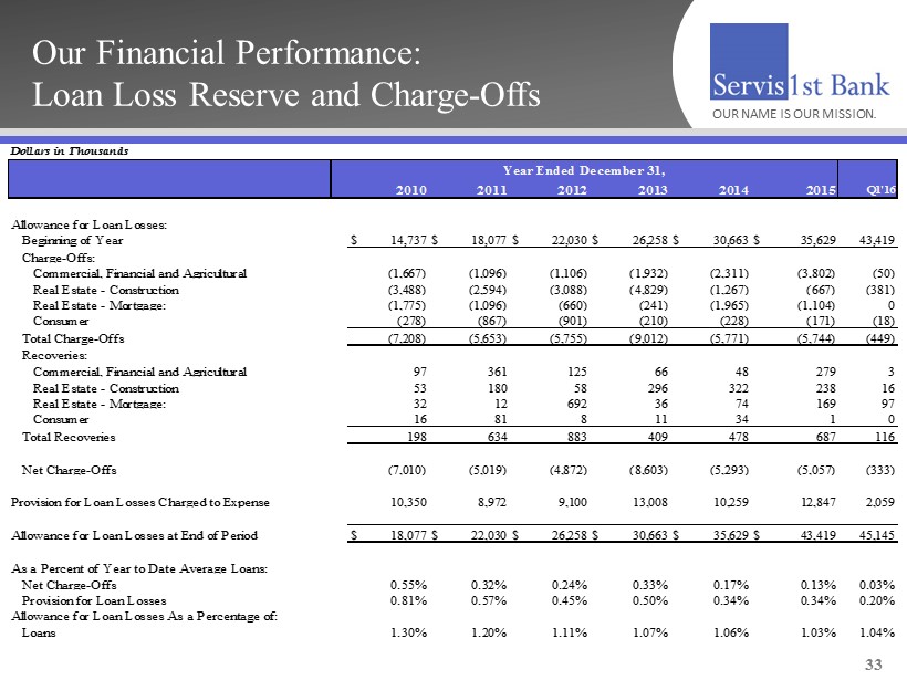 Our Financial Performance: Asset Quality 32 OUR NAME IS OUR MISSION. Dollars in Thousands 2010 2011 2012 2013 2014 2015 Q1'16 Nonaccrual Loans: 1-4 Family 202 670 453 1,878 1,596 198 192 Owner-Occupied Commercial Real Estate 635 792 2,786 1,435 683 -- -- Other Real Estate Loans -- 693 240 243 959 1,619 642 Commercial, Financial & Agricultural 2,164 1,179 276 1,714 172 1,918 1,853 Construction 10,722 10,063 6,460 3,749 5,049 4,000 3,416 Consumer 624 375 135 602 666 31 30 Total Nonaccrual Loans 14,347 13,772 10,350 9,621 9,125 7,766 6,133 Total 90+ Days Past Due and Accruing -- -- 8 115 925 1 417 Total Nonperforming Loans 14,347 13,772 10,358 9,736 10,050 7,767 6,550 Other Real Estate Owned and Repossessions 6,966 12,305 9,721 12,861 6,840 5,392 4,044 Total Nonperforming Assets 21,313 26,077 20,079 22,597 16,890 13,159 10,594 Troubled Debt Restructurings (Accruing): 1-4 Family -- -- 1,709 8,225 -- -- -- Owner-Occupied Commercial Real Estate -- 2,785 3,121 -- -- -- -- Other Real Estate Loans -- 331 302 285 1,663 253 238 Commercial, Financial & Agricultural 2,398 1,369 1,168 962 6,632 6,618 6,525 Construction -- -- 3,213 217 -- -- -- Consumer -- -- -- -- -- -- -- Total Troubled Debt Restructurings (Accruing) 2,398 4,485 9,513 9,689 8,295 6,871 6,763 Total Nonperforming Assets & Troubled Debt Restructurings (Accruing) 23,711 30,562 29,592 32,286 25,185 20,030 17,357 Total Nonperforming Loans to Total Loans 1.03% 0.75% 0.44% 0.34% 0.30% 0.18% 0.15% Total Nonperforming Assets to Total Assets 1.10% 1.06% 0.69% 0.64% 0.41% 0.26% 0.20% Year Ended December 31,