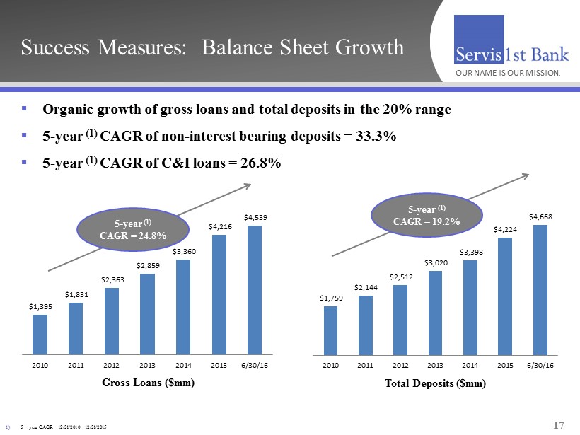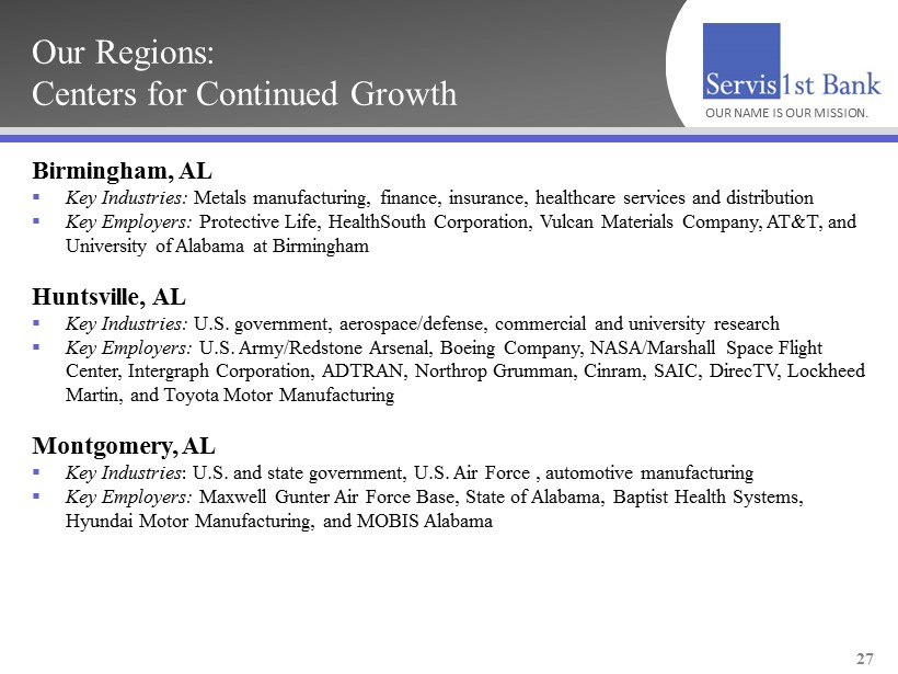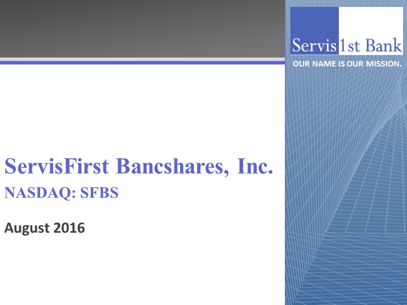 OUR NAME IS OUR MISSION. ServisFirst Bancshares, Inc. NASDAQ: SFBS August 2016