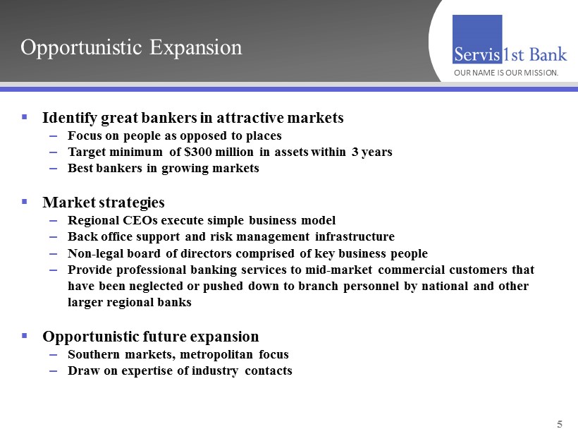 Our Business Strategy ▪ Simple business model – Loans and deposits are primary drivers, not ancillary services ▪ Limited branch footprint – Technology provides efficiency ▪ Big bank products and bankers – With the style of service and delivery of a community bank ▪ Core deposit focus coupled with C&I lending emphasis ▪ Scalable, decentralized business model – Regional CEOs drive revenue ▪ Opportunistic expansion, attractive geographies – Teams of the best bankers in each metropolitan market ▪ Disciplined growth company that sets high standards for performance 4 OUR NAME IS OUR MISSION .