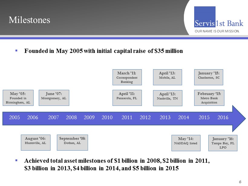 Opportunistic Expansion ▪ Identify great bankers in attractive markets – Focus on people as opposed to places – Target minimum of $300 million in assets within 3 years – Best bankers in growing markets ▪ Market strategies – Regional CEOs execute simple business model – Back office support and risk management infrastructure – Non - legal board of directors comprised of key business people – Provide professional banking services to mid - market commercial customers that have been neglected or pushed down to branch personnel by national and other larger regional banks ▪ Opportunistic future expansion – Southern markets, metropolitan focus – Draw on expertise of industry contacts 5 OUR NAME IS OUR MISSION .