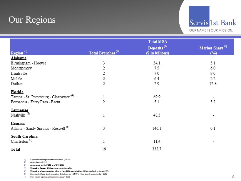 ServisFirst Branches (17) Our Footprint 7 Pensacola Mobile Dothan ServisFirst Branches (19) Nashville Huntsville Birmingham Atlanta Charleston Montgomery Jacksonville Tallahassee Savannah Greenville Knoxville Memphis Chattanooga Houston New Orleans Charlotte Jackson Tampa OUR NAME IS OUR MISSION.