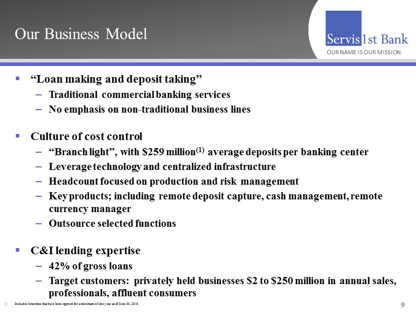 Our Regions 8 OUR NAME IS OUR MISSION. 1) Represents metropolitan statistical areas (MSAs) 2) As of August 2016 3) As reported by the FDIC as of 6/30/2015 4) Opened in January 2016 as a loan production office 5) Opened as a loan production office in June 2013; converted to a full service bank in January 2016 6) Represents Metro Bank acquisition that closed on 1/31/2015; third branch opened in July 2015 7) New region opening announced in January 2015 Total Branches (2) Total MSA Deposits (3) ($ in billions) Market Share (3) (%) 3 34.1 5.1 2 7.5 6.0 2 7.0 9.0 2 6.4 2.2 2 2.9 12.8 1 69.9 - 2 5.1 5.2 1 48.3 - Atlanta - Sandy Springs - Roswell (6) 3 146.1 0.1 Charleston (7) 1 11.4 - 19 338.7 Region (1) Alabama Georgia South Carolina Birmingham - Hoover Huntsville Pensacola - Ferry Pass - Brent Tennessee Total Nashville (5) Montgomery Dothan Mobile Florida Tampa - St. Petersburg - Clearwater (4)