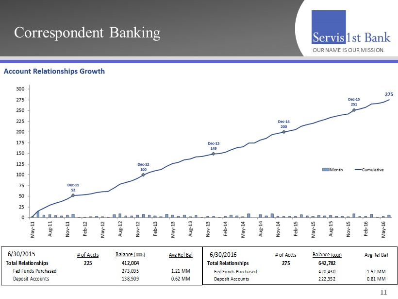 Scalable, Decentralized Structure ▪ Local decision - making – Emphasize local decision - making to drive customer revenue – Centralized, uniform risk management and support – Conservative local lending authorities, covers most lending decisions ▪ Geographic organizational structure (as opposed to line of business structure) ▪ Regional CEOs empowered and held accountable – Utilize stock based compensation to align goals ▪ Top - down sales culture – Senior management actively involved in customer acquisition 10 OUR NAME IS OUR MISSION.