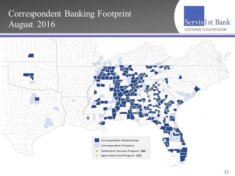 Correspondent Banking OUR NAME IS OUR MISSION . 11 6/30/2015 # of Accts Balance (000s) Avg Rel Bal Total Relationships 225 412,004 Fed Funds Purchased 273,095 1.21 MM Deposit Accounts 138,909 0.62 MM 6/30/2016 # of Accts Balance (000s) Avg Rel Bal Total Relationships 275 642,782 Fed Funds Purchased 420,430 1.52 MM Deposit Accounts 222,352 0.81 MM