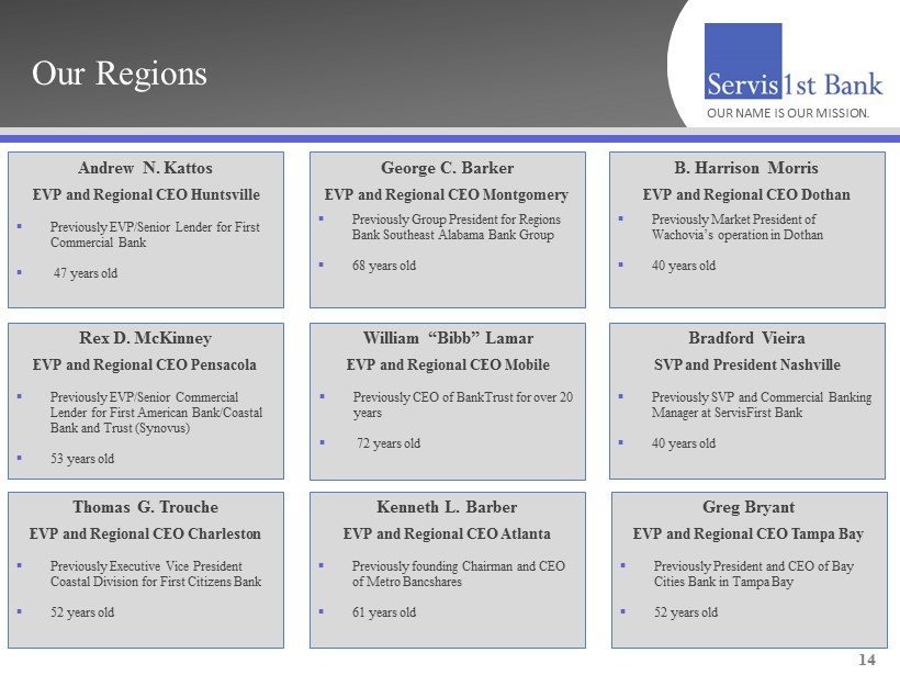 Our Management Team Thomas A. Broughton, III President and Chief Executive Officer ▪ Previously President and CEO of First Commercial Bank (acquired by Synovus Financial, 1992); subsequently, regional CEO for Synovus ▪ American Banker’s 2009 Community Banker of the Year ▪ 61 years old 13 OUR NAME IS OUR MISSION. William M. Foshee EVP and Chief Financial Officer ▪ Previously Chief Financial Officer of Heritage Financial Holding Corporation ▪ Certified public accountant ▪ 61 years old Clarence C. Pouncey , III EVP and Chief Operating Officer ▪ Previously with Wachovia; oversaw production functions in Alabama, Arizona, Tennessee and Texas ▪ Previously SVP of SouthTrust Bank ▪ 59 years old Don G. Owens SVP and Chief Credit Officer ▪ Previously Senior Vice President and Senior Loan Administrator, BBVA - Compass ▪ 64 years old Rodney E. Rushing EVP, Correspondent Banking Executive ▪ Previously Executive Vice President of Correspondent Banking, BBVA - Compass ▪ 58 years old ▪ Management team and Board of Directors own approximately 14% of fully - diluted shares