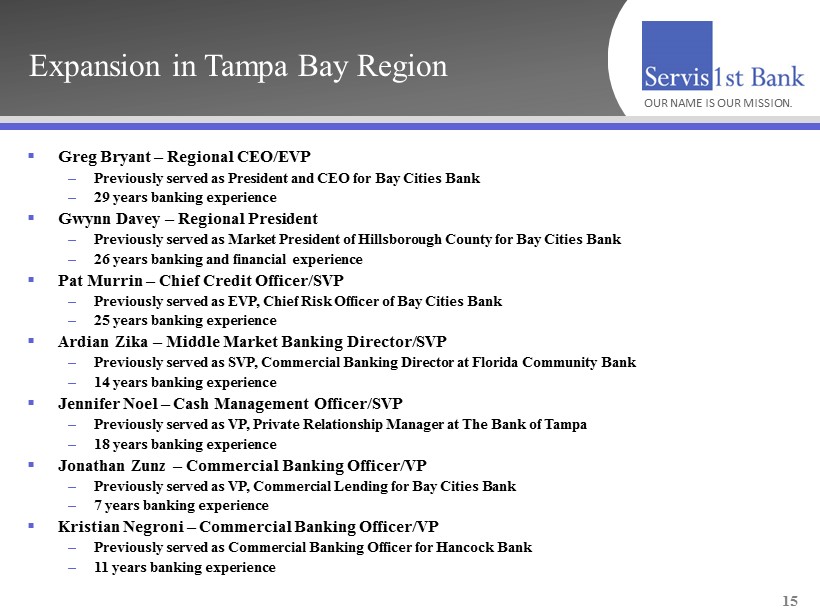 Our Regions Rex D. McKinney EVP and Regional CEO Pensacola ▪ Previously EVP/Senior Commercial Lender for First American Bank/Coastal Bank and Trust ( Synovus ) ▪ 53 years old 14 OUR NAME IS OUR MISSION . Andrew N. Kattos EVP and Regional CEO Huntsville ▪ Previously EVP/Senior Lender for First Commercial Bank ▪ 47 years old Kenneth L. Barber EVP and Regional CEO Atlanta ▪ Previously founding Chairman and CEO of Metro Bancshares ▪ 61 years old William “Bibb” Lamar EVP and Regional CEO Mobile ▪ Previously CEO of BankTrust for over 20 years ▪ 72 years old George C. Barker EVP and Regional CEO Montgomery ▪ Previously Group President for Regions Bank Southeast Alabama Bank Group ▪ 68 years old B. Harrison Morris EVP and Regional CEO Dothan ▪ Previously Market President of Wachovia’s operation in Dothan ▪ 40 years old Greg Bryant EVP and Regional CEO Tampa Bay ▪ Previously President and CEO of Bay Cities Bank in Tampa Bay ▪ 52 years old Thomas G. Trouche EVP and Regional CEO Charleston ▪ Previously Executive Vice President Coastal Division for First Citizens Bank ▪ 52 years old Bradford Vieira SVP and President Nashville ▪ Previously SVP and Commercial Banking Manager at ServisFirst Bank ▪ 40 years old