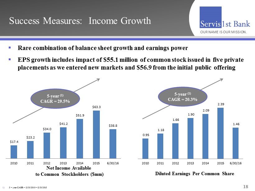 Success Measures: Balance Sheet Growth 17 OUR NAME IS OUR MISSION . 5 - year (1) CAGR = 24.8% 5 - year (1) CAGR = 19.2% Gross Loans ($mm) Total Deposits ($mm) ▪ Organic growth of gross loans and total deposits in the 20% range ▪ 5 - year (1) CAGR of non - interest bearing deposits = 33.3% ▪ 5 - year (1) CAGR of C&I loans = 26.8% $1,395 $1,831 $2,363 $2,859 $3,360 $4,216 $4,539 2010 2011 2012 2013 2014 2015 6/30/16 1) 5 – year CAGR = 12/31/2010 – 12/31/2015 $1,759 $2,144 $2,512 $3,020 $3,398 $4,224 $4,668 2010 2011 2012 2013 2014 2015 6/30/16