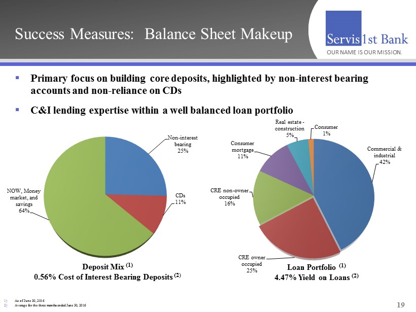 ▪ Rare combination of balance sheet growth and earnings power ▪ EPS growth includes impact of $55.1 million of common stock issued in five private placements as we entered new markets and $56.9 from the initial public offering Success Measures: Income Growth 18 OUR NAME IS OUR MISSION. 5 - year (1) CAGR = 29.5% 5 - year (1) CAGR = 20.3% Net Income Available to Common Stockholders ($mm) Diluted Earnings Per Common Share $17.4 $23.2 $34.0 $41.2 $51.9 $63.3 $38.8 2010 2011 2012 2013 2014 2015 6/30/16 0.95 1.18 1.66 1.90 2.09 2.39 1.46 2010 2011 2012 2013 2014 2015 6/30/16 1) 5 – year CAGR = 12/31/2010 – 12/31/2015
