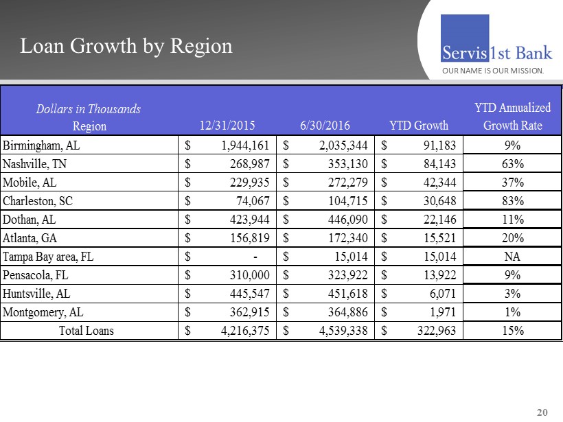 Forward - Looking Statements This presentation contains forward - looking statements within the meaning of the Private Securities Litigation Reform Act of 1995 . In addition, ServisFirst Bancshares, Inc . may file or furnish documents with the Securities and Exchange Commission which contain forward - looking statements and management may make forward - looking statements orally to analysts, investors, representatives of the media and others . These statements are based on the current beliefs and expectations of ServisFirst Bancshares, Inc . ’s management and are subject to significant risks and uncertainties . Actual results may differ from those set forth in the forward - looking statements . Factors that could cause ServisFirst Bancshares, Inc . ’s actual results to differ materially from those described in the forward - looking statements can be found in ServisFirst Bancshares, Inc . ’s Annual Report on Form 10 - K for the year ended December 31 , 2015 , and Quarterly Reports on Form 10 - Q for the quarters ended June 30 , 2016 , March 31 , 2016 , and September 30 , 2015 which have been filed with the Securities and Exchange Commission and which are available on ServisFirst Bancshares, Inc . ’s website ( www . servisfirstbank . com ) and on the Securities and Exchange Commission’s website ( www . sec . gov ) . ServisFirst Bancshares, Inc . does not undertake to update the forward - looking statements to reflect the impact of circumstances or events that may arise after the date of the forward - looking statements . ▪ Non - GAAP Financial Measures This presentation includes non - GAAP financial measures . Information about any such non - GAAP financial measures, including a reconciliation of those measures to GAAP, can be found in the presentation . 2 OUR NAME IS OUR MISSION.
