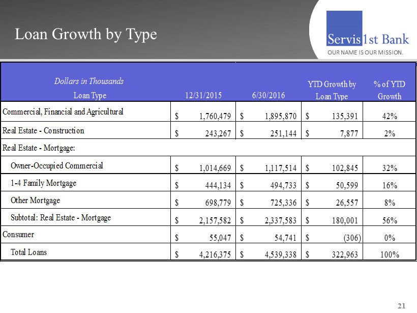 Loan Growth by Region 20 OUR NAME IS OUR MISSION . 12/31/2015 6/30/2016 YTD Growth YTD Annualized Growth Rate Birmingham, AL 1,944,161$ 2,035,344$ 91,183$ 9% Nashville, TN 268,987$ 353,130$ 84,143$ 63% Mobile, AL 229,935$ 272,279$ 42,344$ 37% Charleston, SC 74,067$ 104,715$ 30,648$ 83% Dothan, AL 423,944$ 446,090$ 22,146$ 11% Atlanta, GA 156,819$ 172,340$ 15,521$ 20% Tampa Bay area, FL -$ 15,014$ 15,014$ NA Pensacola, FL 310,000$ 323,922$ 13,922$ 9% Huntsville, AL 445,547$ 451,618$ 6,071$ 3% Montgomery, AL 362,915$ 364,886$ 1,971$ 1% Total Loans 4,216,375$ 4,539,338$ 322,963$ 15% Dollars in Thousands Region