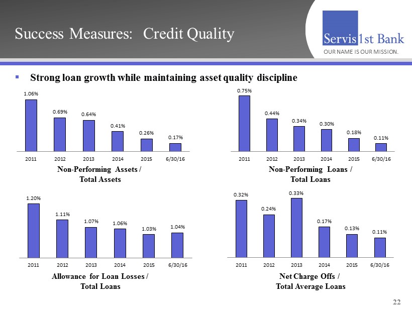 Loan Growth by Type OUR NAME IS OUR MISSION. 21 Dollars in Thousands Loan Type 12/31/2015 6/30/2016 1,760,479$ 1,895,870$ 135,391$ 42% 243,267$ 251,144$ 7,877$ 2% Owner-Occupied Commercial 1,014,669$ 1,117,514$ 102,845$ 32% 1-4 Family Mortgage 444,134$ 494,733$ 50,599$ 16% Other Mortgage 698,779$ 725,336$ 26,557$ 8% Subtotal: Real Estate - Mortgage 2,157,582$ 2,337,583$ 180,001$ 56% 55,047$ 54,741$ (306)$ 0% Total Loans 4,216,375$ 4,539,338$ 322,963$ 100% YTD Growth by Loan Type % of YTD Growth Real Estate - Mortgage: Commercial, Financial and Agricultural Real Estate - Construction Consumer