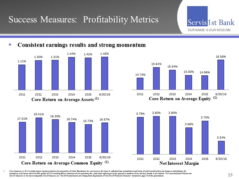▪ Strong loan growth while maintaining asset quality discipline Success Measures: Credit Quality 22 OUR NAME IS OUR MISSION. Allowance for Loan Losses / Total Loans Net Charge Offs / Total Average Loans Non - Performing Assets / Total Assets Non - Performing Loans / Total Loans 1.06% 0.69% 0.64% 0.41% 0.26% 0.17% 2011 2012 2013 2014 2015 6/30/16 0.75% 0.44% 0.34% 0.30% 0.18% 0.11% 2011 2012 2013 2014 2015 6/30/16 0.32% 0.24% 0.33% 0.17% 0.13% 0.11% 2011 2012 2013 2014 2015 6/30/16 1.20% 1.11% 1.07% 1.06% 1.03% 1.04% 2011 2012 2013 2014 2015 6/30/16