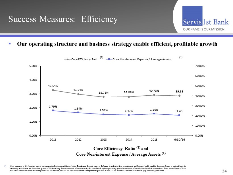 ▪ Consistent earnings results and strong momentum Success Measures: Profitability Metrics 23 OUR NAME IS OUR MISSION . Core Return on Average Assets (1) Core Return on Average Equity (1) Core Return on Average Common Equity (1) Net Interest Margin 1) Core measures in 2015 exclude merger expenses related to the acquisition of Metro Bancshares, Inc. and reserves for losses in un funded loan commitments and letters of credit resulting from our change in methodology for estimating such losses, and in the first quarter of 2014 resulting from a correction of our accounting for vested stock optio ns previously granted to members of our advisory boards in our markets. For a reconciliation of these non - GAAP measures to the most comparable GAAP measure, see "GAAP Reconciliation and Management Explanation of Non - GAAP Financial Mea sures" included on page 34 of this presentation. 1.11% 1.30% 1.31% 1.44% 1.42% 1.45% 2011 2012 2013 2014 2015 6/30/16 17.01% 19.41% 18.30% 16.74% 15.73% 16.57% 2011 2012 2013 2014 2015 6/30/16 3.79% 3.80% 3.80% 3.68% 3.75% 3.54% 2011 2012 2013 2014 2015 6/30/16 14.73% 15.81% 15.54% 15.00% 14.96% 16.58% 2011 2012 2013 2014 2015 6/30/16