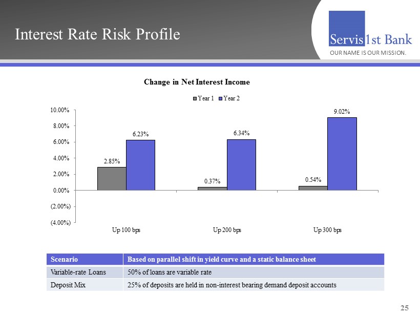 ▪ Our operating structure and business strategy enable efficient, profitable growth Success Measures: Efficiency 24 OUR NAME IS OUR MISSION. Core Efficiency Ratio (1) and Core Non - interest Expense / Average Assets (1) (1) (1) 45.54% 41.54% 38.78% 38.86% 40.73% 39.85 1.79% 1.64% 1.51% 1.47% 1.56% 1.45 0.00% 1.00% 2.00% 3.00% 4.00% 5.00% 2011 2012 2013 2014 2015 6/30/16 0.00% 10.00% 20.00% 30.00% 40.00% 50.00% 60.00% 70.00% Core Efficiency Ratio Core Non-interest Expense / Average Assets 1) Core measures in 2015 exclude merger expenses related to the acquisition of Metro Bancshares, Inc . and reserves for losses in unfunded loan commitments and letters of credit resulting from our change in methodology for estimating such losses, and in the first quarter of 2014 resulting from a correction of our accounting for vested stock options previously granted to members of our advisory boards in our markets . For a reconciliation of these non - GAAP measures to the most comparable GAAP measure, see "GAAP Reconciliation and Management Explanation of Non - GAAP Financial Measures" included on page 34 of this presentation .