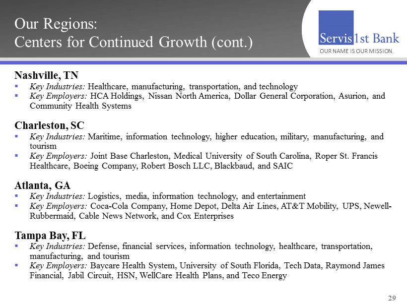 Our Regions: Centers for Continued Growth (cont.) Dothan, AL ▪ Key Industries: Agriculture, manufacturing, and healthcare services ▪ Key Employers: Southeast Alabama Medical Center, Wayne Farms, Southern Nuclear, Michelin Tire, Pemco World Air Services, Globe Motors, and AAA Cooper Transportation Pensacola, FL ▪ Key Industries: Military, health services, medical technology industries, and tourism ▪ Key Employers: Eglin Air Force Base, Hurlburt Field, Pensacola Whiting Field, Pensacola Naval Air Station and Corry Station, Sacred Heart Health System, West Florida Regional Hospital, Gulf Power Company, University of West Florida, Solutia, and GE Wind Energy Mobile, AL ▪ Key Industries: Aircraft assembly, aerospace, steel, ship building, maritime, construction, medicine, and manufacturing ▪ Key Employers: Port of Mobile, Infirmary Health Systems, Austal USA, Brookley Aeroplex , ThyssenKrupp, Infirmary Health Systems, University of South Alabama, ST Aerospace Mobile, and EADS 28 OUR NAME IS OUR MISSION.