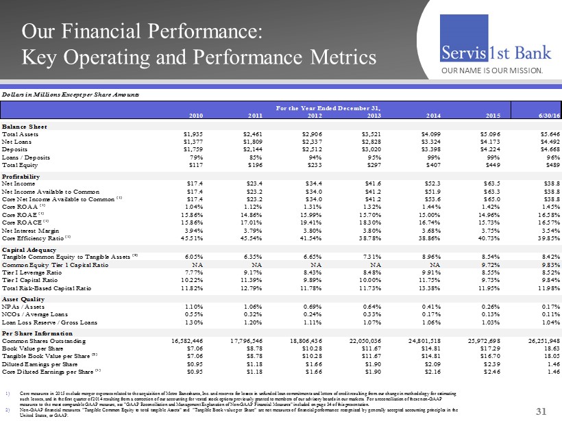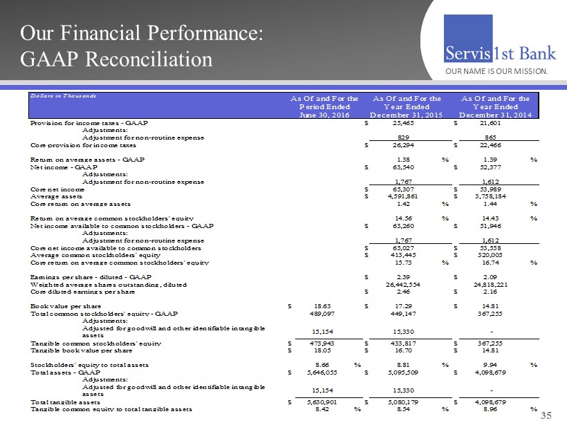 GAAP Reconciliation and Management Explanation of Non - GAAP Financial Measures 34 OUR NAME IS OUR MISSION . We recorded expenses of $2.1 million for the first quarter of 2015 related to the acquisition of Metro Bancshares, Inc. and t he merger of Metro Bank with and into the Bank, and recorded an expense of $500,000 resulting from the initial funding of reserves for unfunded loan commi tme nts as of March 31, 2015, consistent with guidance provided in the Federal Reserve Bank’s Inter - agency Policy Statement SR 06 - 17. We recorded a non - routine expense of $703,000 for the first quarter of 2014 resulting from the correction of our accounting for vested stock options previously gr ant ed to members of our advisory boards in our Dothan, Huntsville and Montgomery, Alabama markets. This change in accounting treatment is a non - cash it em and does not impact our operating activities or cash from operations. The non - GAAP financial measures included in this presentation release of our results are “core net income available to common stockholders,” “core diluted earnings per share,” “core return on average assets” , “core retu rn on average common stockholders’ equity”, “core return on average stockholders’ equity”, “core efficiency ratio”, and “core non - interest expense.” Each of these seven core financial measures excludes the impact of the merger expenses, the initial funding of a reserve for unfunded loan commitments , a nd the non - routine expense attributable to the correction of our accounting for vested stock options. None of the other periods included in thi s p resentation are affected by such non - routine expenses. “Core net income available to common stockholders” is defined as net income available to common stockholders, adjusted by the ne t effect of the non - routine expense. “Core diluted earnings per share” is defined as net income available to common stockholders, adjusted by the net effect of th e n on - routine expense, divided by weighted average diluted shares outstanding. “Core return on average assets” is defined as net income, adjusted by the net effect of the non - routine expense, divided by aver age total assets. “Core return on average common stockholders’ equity” is defined as net income, adjusted by the net effect of the non - routine exp ense, divided by average common stockholders’ equity. “Core return of average stockholders’ equity” is defined as net income, adjusted by the net effect of the non - routine expense, d ivided by average total stockholders’ equity. “Core efficiency ratio” is defined as non - interest expense, adjusted by the effect of the non - routine expense, divided by the su m of net interest income and non - interest income. “Core non - interest expense” is defined as non - interest expense, adjusted by the effect of the non - routine expense. We believe these non - GAAP financial measures provide useful information to management and investors that is supplementary to our financial condition, results of operations and cash flows computed in accordance with GAAP; however, we acknowledge that these non - GAAP fi nancial measures have a number of limitations. As such, you should not view these disclosures as a substitute for results determined in accor dan ce with GAAP, and they are not necessarily comparable to non - GAAP financial measures that other companies, including those in our industry, use. The f ollowing reconciliation table provides a more detailed analysis of the non - GAAP financial measures for the twelve month comparative periods ended Decemb er 31, 2015 and 2014 included in this presentation. Dollars are in thousands, except share and per share data.