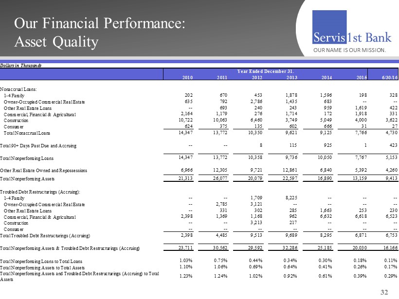Our Financial Performance: Key Operating and Performance Metrics 31 OUR NAME IS OUR MISSION . Dollars in Millions Except per Share Amounts 2010 2011 2012 2013 2014 2015 6/30/16 Balance Sheet Total Assets $1,935 $2,461 $2,906 $3,521 $4.099 $5.096 $5.646 Net Loans $1,377 $1,809 $2,337 $2,828 $3.324 $4.173 $4.492 Deposits $1,759 $2,144 $2,512 $3,020 $3.398 $4.224 $4.668 Loans / Deposits 79% 85% 94% 95% 99% 99% 96% Total Equity $117 $196 $233 $297 $407 $449 $489 Profitability Net Income $17.4 $23.4 $34.4 $41.6 $52.3 $63.5 $38.8 Net Income Available to Common $17.4 $23.2 $34.0 $41.2 $51.9 $63.3 $38.8 Core Net Income Available to Common (1) $17.4 $23.2 $34.0 $41.2 $53.6 $65.0 $38.8 Core ROAA (1) 1.04% 1.12% 1.31% 1.32% 1.44% 1.42% 1.45% Core ROAE (1) 15.86% 14.86% 15.99% 15.70% 15.00% 14.96% 16.58% Core ROACE (1) 15.86% 17.01% 19.41% 18.30% 16.74% 15.73% 16.57% Net Interest Margin 3.94% 3.79% 3.80% 3.80% 3.68% 3.75% 3.54% Core Efficiency Ratio (1) 45.51% 45.54% 41.54% 38.78% 38.86% 40.73% 39.85% Capital Adequacy Tangible Common Equity to Tangible Assets (2) 6.05% 6.35% 6.65% 7.31% 8.96% 8.54% 8.42% Common Equity Tier 1 Capital Ratio NA NA NA NA NA 9.72% 9.83% Tier I Leverage Ratio 7.77% 9.17% 8.43% 8.48% 9.91% 8.55% 8.52% Tier I Capital Ratio 10.22% 11.39% 9.89% 10.00% 11.75% 9.73% 9.84% Total Risk-Based Capital Ratio 11.82% 12.79% 11.78% 11.73% 13.38% 11.95% 11.98% Asset Quality NPAs / Assets 1.10% 1.06% 0.69% 0.64% 0.41% 0.26% 0.17% NCOs / Average Loans 0.55% 0.32% 0.24% 0.33% 0.17% 0.13% 0.11% Loan Loss Reserve / Gross Loans 1.30% 1.20% 1.11% 1.07% 1.06% 1.03% 1.04% Per Share Information Common Shares Outstanding 16,582,446 17,796,546 18,806,436 22,050,036 24,801,518 25,972,698 26,251,948 Book Value per Share $7.06 $8.78 $10.28 $11.67 $14.81 $17.29 18.63 Tangible Book Value per Share (2) $7.06 $8.78 $10.28 $11.67 $14.81 $16.70 18.05 Diluted Earnings per Share $0.95 $1.18 $1.66 $1.90 $2.09 $2.39 1.46 Core Diluted Earnings per Share (1) $0.95 $1.18 $1.66 $1.90 $2.16 $2.46 1.46 For the Year Ended December 31, 1) Core measures in 2015 exclude merger expenses related to the acquisition of Metro Bancshares, Inc. and reserves for losses in un funded loan commitments and letters of credit resulting from our change in methodology for estimating such losses, and in the first quarter of 2014 resulting from a correction of our accounting for vested stock options previous ly granted to members of our advisory boards in our markets. For a reconciliation of these non - GAAP measures to the most comparable GAAP measure, see "GAAP Reconciliation and Management Explanation of Non - GAAP Financial Measures " included on page 34 of this presentation. 2) Non - GAAP financial measures . "Tangible Common Equity to total tangible Assets" and "Tangible Book value per Share" are not measures of financial performance recognized by generally accepted accounting principles in the United States, or GAAP .
