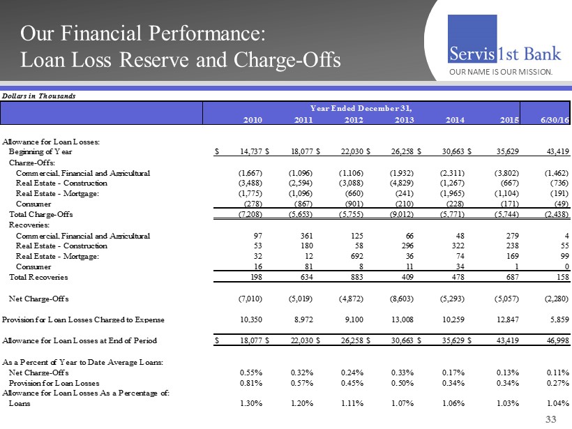 Our Financial Performance: Asset Quality 32 OUR NAME IS OUR MISSION. Dollars in Thousands 2010 2011 2012 2013 2014 2015 6/30/16 Nonaccrual Loans: 1-4 Family 202 670 453 1,878 1,596 198 328 Owner-Occupied Commercial Real Estate 635 792 2,786 1,435 683 -- -- Other Real Estate Loans -- 693 240 243 959 1,619 422 Commercial, Financial & Agricultural 2,164 1,179 276 1,714 172 1,918 331 Construction 10,722 10,063 6,460 3,749 5,049 4,000 3,622 Consumer 624 375 135 602 666 31 27 Total Nonaccrual Loans 14,347 13,772 10,350 9,621 9,125 7,766 4,730 Total 90+ Days Past Due and Accruing -- -- 8 115 925 1 423 Total Nonperforming Loans 14,347 13,772 10,358 9,736 10,050 7,767 5,153 Other Real Estate Owned and Repossessions 6,966 12,305 9,721 12,861 6,840 5,392 4,260 Total Nonperforming Assets 21,313 26,077 20,079 22,597 16,890 13,159 9,413 Troubled Debt Restructurings (Accruing): 1-4 Family -- -- 1,709 8,225 -- -- -- Owner-Occupied Commercial Real Estate -- 2,785 3,121 -- -- -- -- Other Real Estate Loans -- 331 302 285 1,663 253 230 Commercial, Financial & Agricultural 2,398 1,369 1,168 962 6,632 6,618 6,523 Construction -- -- 3,213 217 -- -- -- Consumer -- -- -- -- -- -- -- Total Troubled Debt Restructurings (Accruing) 2,398 4,485 9,513 9,689 8,295 6,871 6,753 Total Nonperforming Assets & Troubled Debt Restructurings (Accruing) 23,711 30,562 29,592 32,286 25,185 20,030 16,166 Total Nonperforming Loans to Total Loans 1.03% 0.75% 0.44% 0.34% 0.30% 0.18% 0.11% Total Nonperforming Assets to Total Assets 1.10% 1.06% 0.69% 0.64% 0.41% 0.26% 0.17% Total Nonperforming Assets and Troubled Debt Restructurings (Accruing) to Total Assets 1.23% 1.24% 1.02% 0.92% 0.61% 0.39% 0.29% Year Ended December 31,