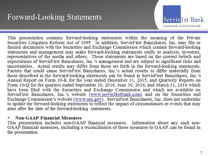 Forward - Looking Statements This presentation contains forward - looking statements within the meaning of the Private Securities Litigation Reform Act of 1995 . In addition, ServisFirst Bancshares, Inc . may file or furnish documents with the Securities and Exchange Commission which contain forward - looking statements and management may make forward - looking statements orally to analysts, investors, representatives of the media and others . These statements are based on the current beliefs and expectations of ServisFirst Bancshares, Inc . ’s management and are subject to significant risks and uncertainties . Actual results may differ from those set forth in the forward - looking statements . Factors that could cause ServisFirst Bancshares, Inc . ’s actual results to differ materially from those described in the forward - looking statements can be found in ServisFirst Bancshares, Inc . ’s Annual Report on Form 10 - K for the year ended December 31 , 2015 , and Quarterly Reports on Form 10 - Q for the quarters ended September 30 , 2016 , June 30 , 2016 , and March 31 , 2016 which have been filed with the Securities and Exchange Commission and which are available on ServisFirst Bancshares, Inc . ’s website ( www . servisfirstbank . com ) and on the Securities and Exchange Commission’s website ( www . sec . gov ) . ServisFirst Bancshares, Inc . does not undertake to update the forward - looking statements to reflect the impact of circumstances or events that may arise after the date of the forward - looking statements . ▪ Non - GAAP Financial Measures This presentation includes non - GAAP financial measures . Information about any such non - GAAP financial measures, including a reconciliation of those measures to GAAP, can be found in the presentation . 2 OUR NAME IS OUR MISSION.