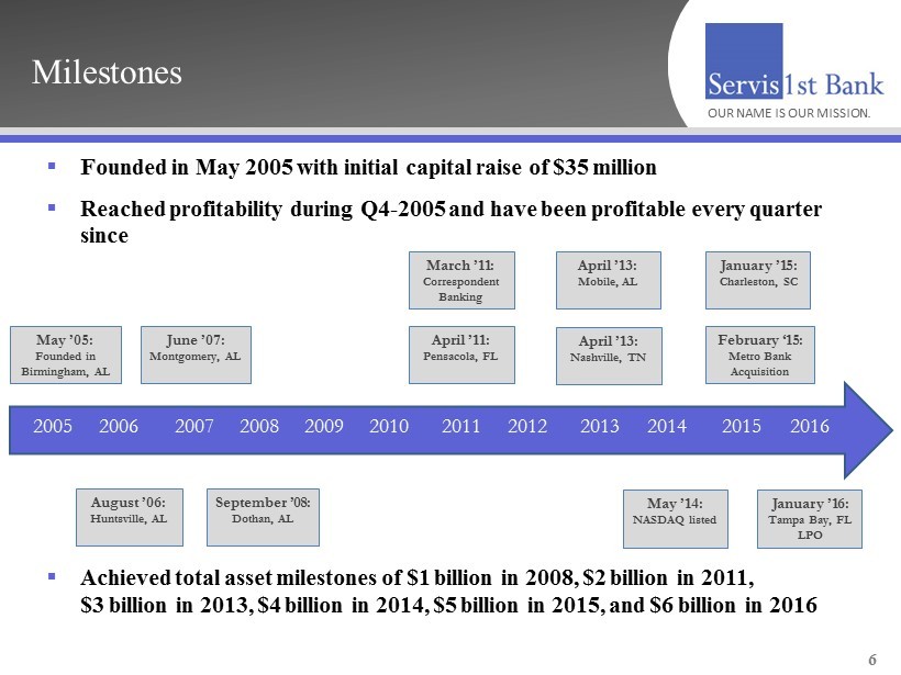 Opportunistic Expansion ▪ Identify great bankers in attractive markets – Focus on people as opposed to places – Target minimum of $300 million in assets within 3 years – Best bankers in growing markets ▪ Market strategies – Regional CEOs execute simple business model – Back office support and risk management infrastructure – Non - legal board of directors comprised of key business people – Provide professional banking services to mid - market commercial customers that have been neglected or pushed down to branch personnel by national and other larger regional banks ▪ Opportunistic future expansion – Southern markets, metropolitan focus – Draw on expertise of industry contacts 5 OUR NAME IS OUR MISSION .
