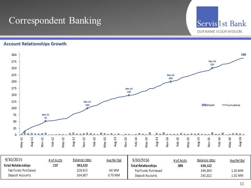 Scalable, Decentralized Structure ▪ Local decision - making – Emphasize local decision - making to drive customer revenue – Centralized, uniform risk management and support – Conservative local lending authorities, covers most lending decisions ▪ Geographic organizational structure (as opposed to line of business structure) ▪ Regional CEOs empowered and held accountable – Utilize stock based compensation to align goals ▪ Top - down sales culture – Senior management actively involved in customer acquisition 10 OUR NAME IS OUR MISSION.