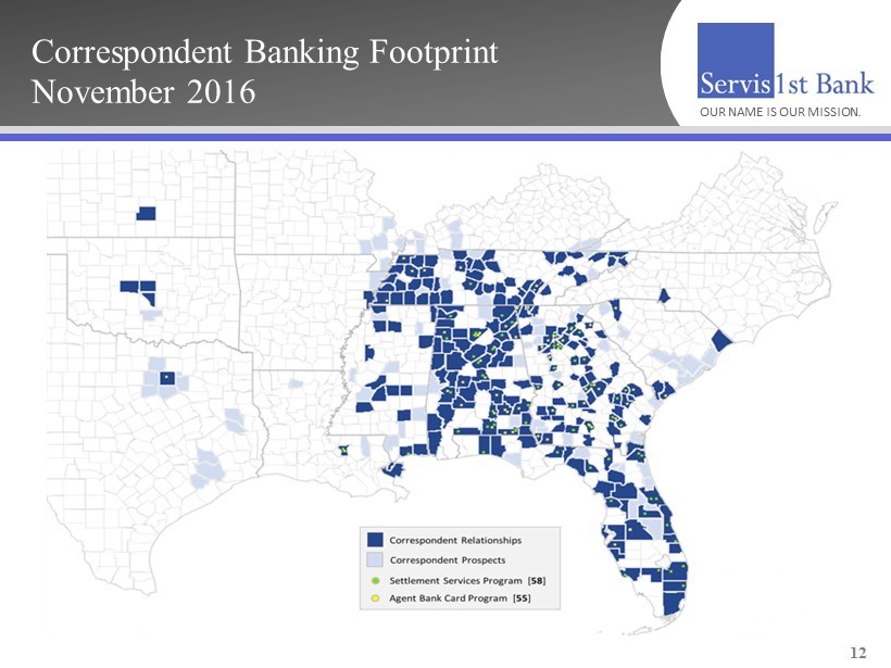 Correspondent Banking OUR NAME IS OUR MISSION . 11 9/30/2015 # of Accts Balance (000s) Avg Rel Bal Total Relationships 237 393,322 Fed Funds Purchased 228,415 .96 MM Deposit Accounts 164,907 0.70 MM 9/30/2016 # of Accts Balance (000s) Avg Rel Bal Total Relationships 288 634,512 Fed Funds Purchased 344,390 1.20 MM Deposit Accounts 291,022 1.01 MM