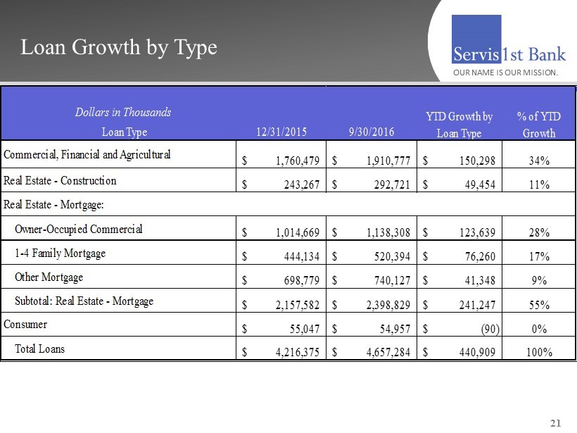 Loan Growth by Region 20 OUR NAME IS OUR MISSION . 12/31/2015 9/30/2016 YTD Growth YTD Annualized Growth Rate Birmingham, AL 1,944,161$ 2,069,014$ 124,853$ 9% Nashville, TN 268,987$ 374,394$ 105,407$ 52% Mobile, AL 229,935$ 275,805$ 45,870$ 27% Charleston, SC 74,067$ 117,281$ 43,214$ 78% Tampa Bay area, FL -$ 30,600$ 30,600$ NA Atlanta, GA 156,819$ 186,336$ 29,517$ 25% Dothan, AL 423,944$ 451,878$ 27,934$ 9% Pensacola, FL 310,000$ 328,421$ 18,421$ 8% Huntsville, AL 445,547$ 454,568$ 9,021$ 3% Montgomery, AL 362,915$ 368,986$ 6,071$ 2% Total Loans 4,216,375$ 4,657,284$ 440,909$ 14% Dollars in Thousands Region