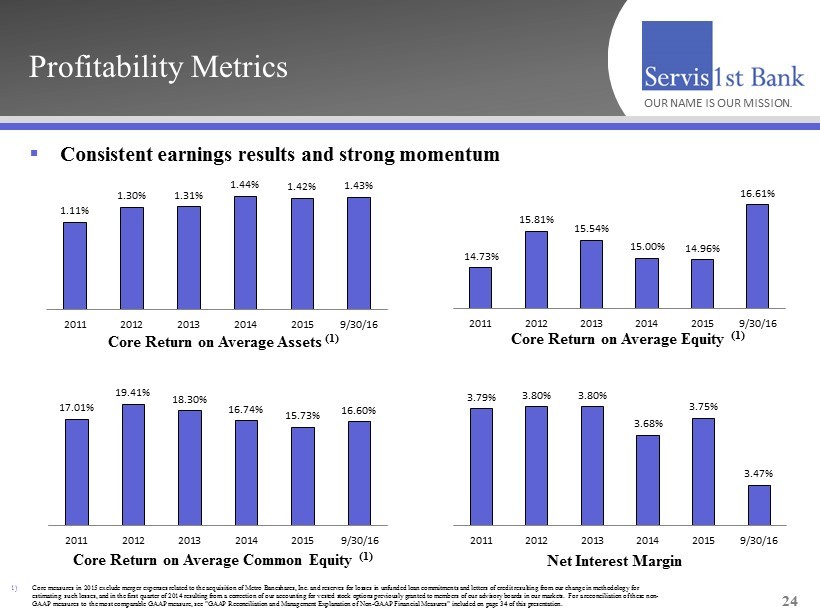 ▪ Strong loan growth while maintaining asset quality discipline Credit Quality 23 OUR NAME IS OUR MISSION. Allowance for Loan Losses / Total Loans Net Charge Offs / Total Average Loans Non - Performing Assets / Total Assets Non - Performing Loans / Total Loans 1.06% 0.69% 0.64% 0.41% 0.26% 0.16% 2011 2012 2013 2014 2015 9/30/16 0.75% 0.44% 0.34% 0.30% 0.18% 0.14% 2011 2012 2013 2014 2015 9/30/16 0.32% 0.24% 0.33% 0.17% 0.13% 0.11% 2011 2012 2013 2014 2015 9/30/16 1.20% 1.11% 1.07% 1.06% 1.03% 1.05% 2011 2012 2013 2014 2015 9/30/16