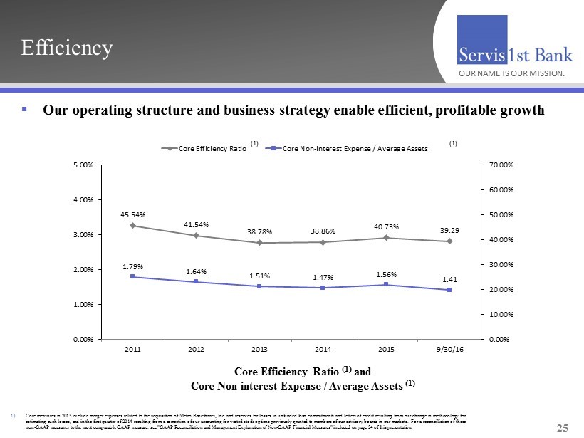 ▪ Consistent earnings results and strong momentum Profitability Metrics 24 OUR NAME IS OUR MISSION . Core Return on Average Assets (1) Core Return on Average Equity (1) Core Return on Average Common Equity (1) Net Interest Margin 1) Core measures in 2015 exclude merger expenses related to the acquisition of Metro Bancshares, Inc. and reserves for losses in un funded loan commitments and letters of credit resulting from our change in methodology for estimating such losses, and in the first quarter of 2014 resulting from a correction of our accounting for vested stock optio ns previously granted to members of our advisory boards in our markets. For a reconciliation of these non - GAAP measures to the most comparable GAAP measure, see "GAAP Reconciliation and Management Explanation of Non - GAAP Financial Mea sures" included on page 34 of this presentation. 1.11% 1.30% 1.31% 1.44% 1.42% 1.43% 2011 2012 2013 2014 2015 9/30/16 17.01% 19.41% 18.30% 16.74% 15.73% 16.60% 2011 2012 2013 2014 2015 9/30/16 3.79% 3.80% 3.80% 3.68% 3.75% 3.47% 2011 2012 2013 2014 2015 9/30/16 14.73% 15.81% 15.54% 15.00% 14.96% 16.61% 2011 2012 2013 2014 2015 9/30/16
