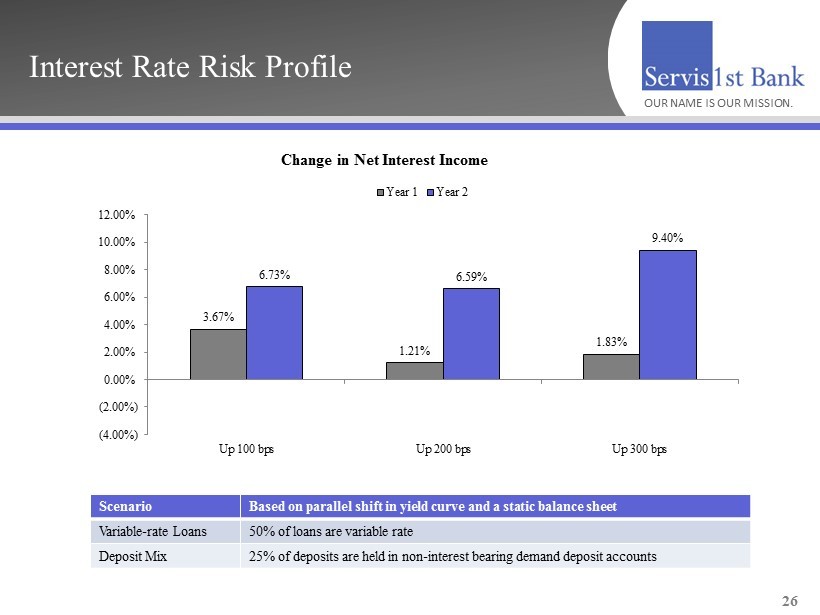 ▪ Our operating structure and business strategy enable efficient, profitable growth Efficiency 25 OUR NAME IS OUR MISSION. Core Efficiency Ratio (1) and Core Non - interest Expense / Average Assets (1) (1) (1) 45.54% 41.54% 38.78% 38.86% 40.73% 39.29 1.79% 1.64% 1.51% 1.47% 1.56% 1.41 0.00% 1.00% 2.00% 3.00% 4.00% 5.00% 2011 2012 2013 2014 2015 9/30/16 0.00% 10.00% 20.00% 30.00% 40.00% 50.00% 60.00% 70.00% Core Efficiency Ratio Core Non-interest Expense / Average Assets 1) Core measures in 2015 exclude merger expenses related to the acquisition of Metro Bancshares, Inc . and reserves for losses in unfunded loan commitments and letters of credit resulting from our change in methodology for estimating such losses, and in the first quarter of 2014 resulting from a correction of our accounting for vested stock options previously granted to members of our advisory boards in our markets . For a reconciliation of these non - GAAP measures to the most comparable GAAP measure, see "GAAP Reconciliation and Management Explanation of Non - GAAP Financial Measures" included on page 34 of this presentation .